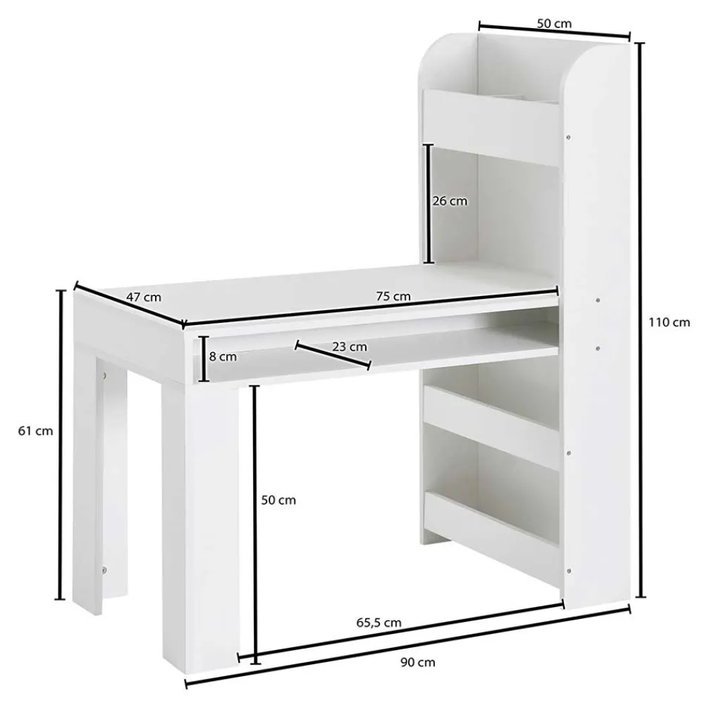 Trotz seiner kompakten Maße stellt der Schreibtisch eine beeindruckende Menge an Stauraum zur Verfügung. Drei seitliche offene Ablagefächer auf der Seite bieten Raum für Bücher, Ordner, Spielzeug oder Bastelmaterialien. Zusätzlich befindet sich unter der Tischplatte eine großzügige Ablagefläche – ideal für Hefte, Stifteboxen oder Tablet. So bleibt die Arbeitsfläche frei und ordentlich. Die Tischplatte selbst hat eine angenehme Arbeitshöhe von 61 cm und eine Stärke von ca. 1,5 cm – ausreichend stabil für den Alltag, dabei nicht zu wuchtig, sodass das Gesamtbild luftig bleibt.