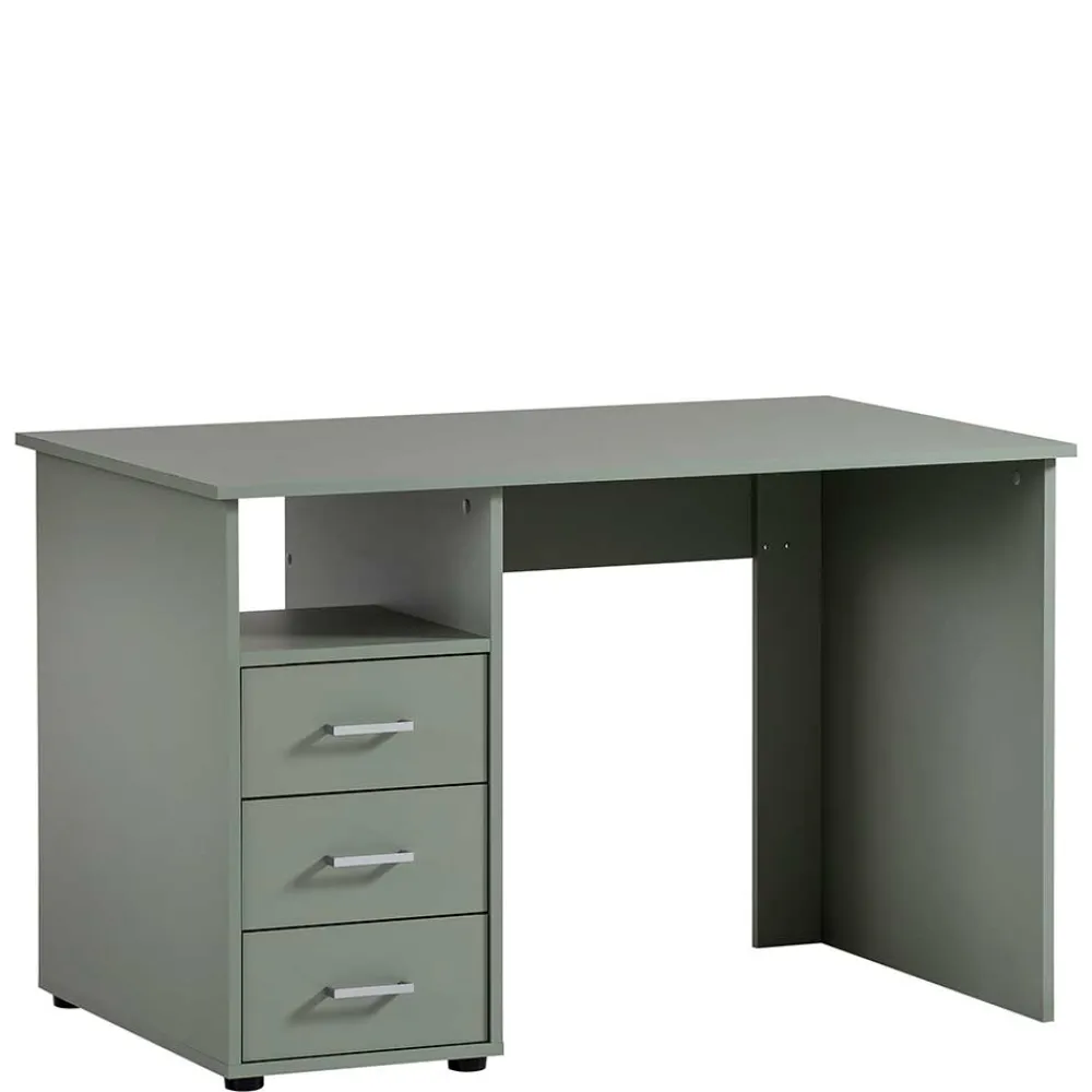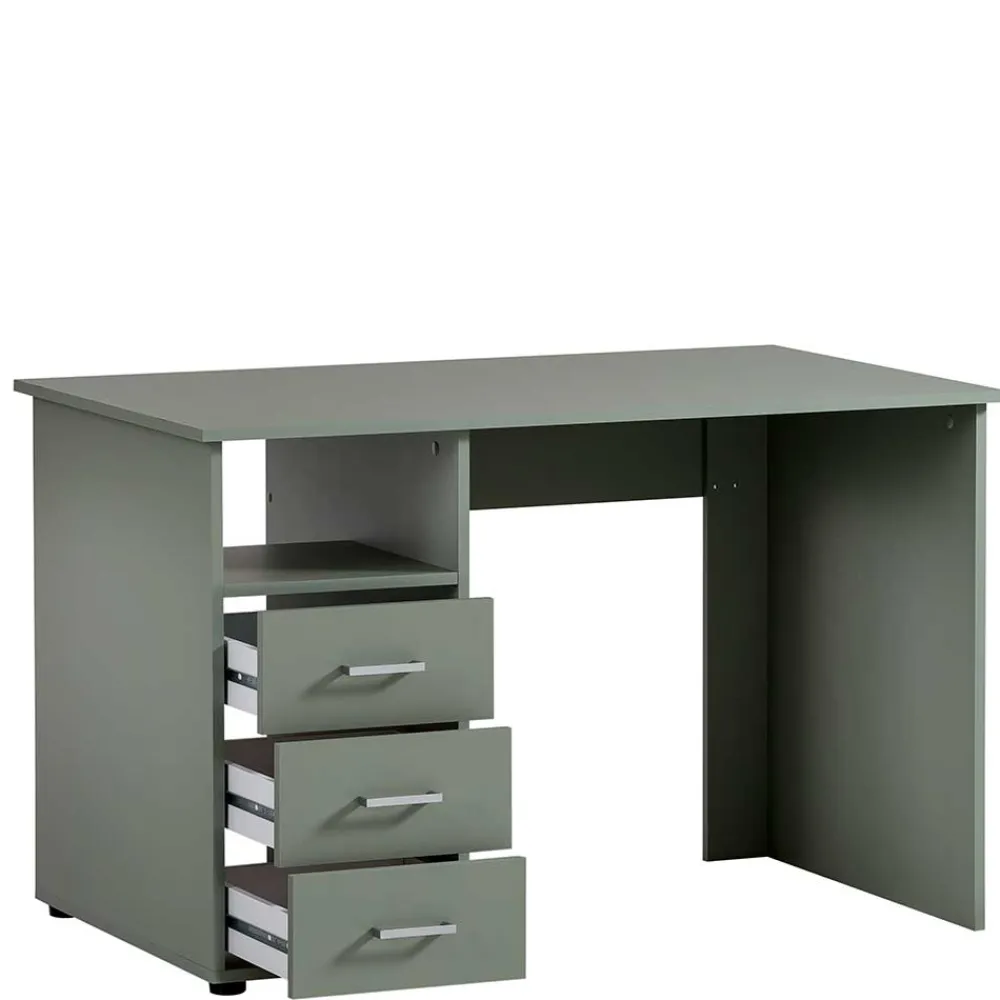 Mit einer großzügigen Arbeitsfläche von 116 cm Breite und 70 cm Tiefe bietet die Tischplatte genügend Raum für Laptop, Schreibutensilien, Unterlagen und alles, was zum konzentrierten Arbeiten nötig ist. Das integrierte Schrankelement auf der linken Seite liefert jede Menge Stauraum: Drei Schubladen mit robusten Metallauszügen und praktischen Metall-Bügelgriffen bringen Struktur in den Alltag. Daneben bietet ein offenes Fach schnellen Zugriff auf Bücher oder Notizblöcke. Und dank der Kunststoff-Bodengleiter bleibt der Boden dabei stets geschont.
