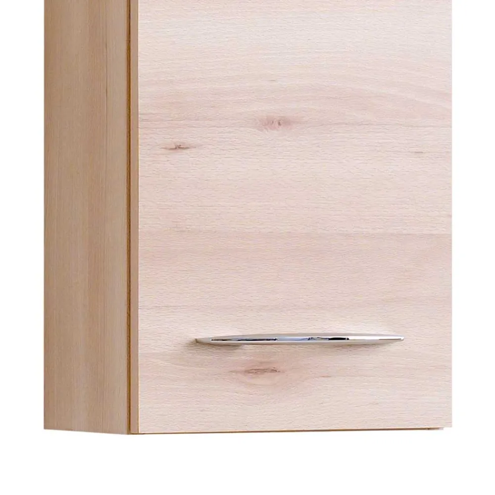 Alle Oberflächen sind mit einer strapazierfähigen Melaminbeschichtung in Buche hell versehen. Dieses Verfahren veredelt die Spanplatte mit einer hitze- und feuchtigkeitsresistenten Kunststoffschicht, die gleichzeitig pflegeleicht und kratzfest ist. Wasserabweisende Eigenschaften machen den Schrank zur idealen Wahl für das Badezimmer – einfach mit einem feuchten Tuch abwischen, und alles sieht aus wie neu.