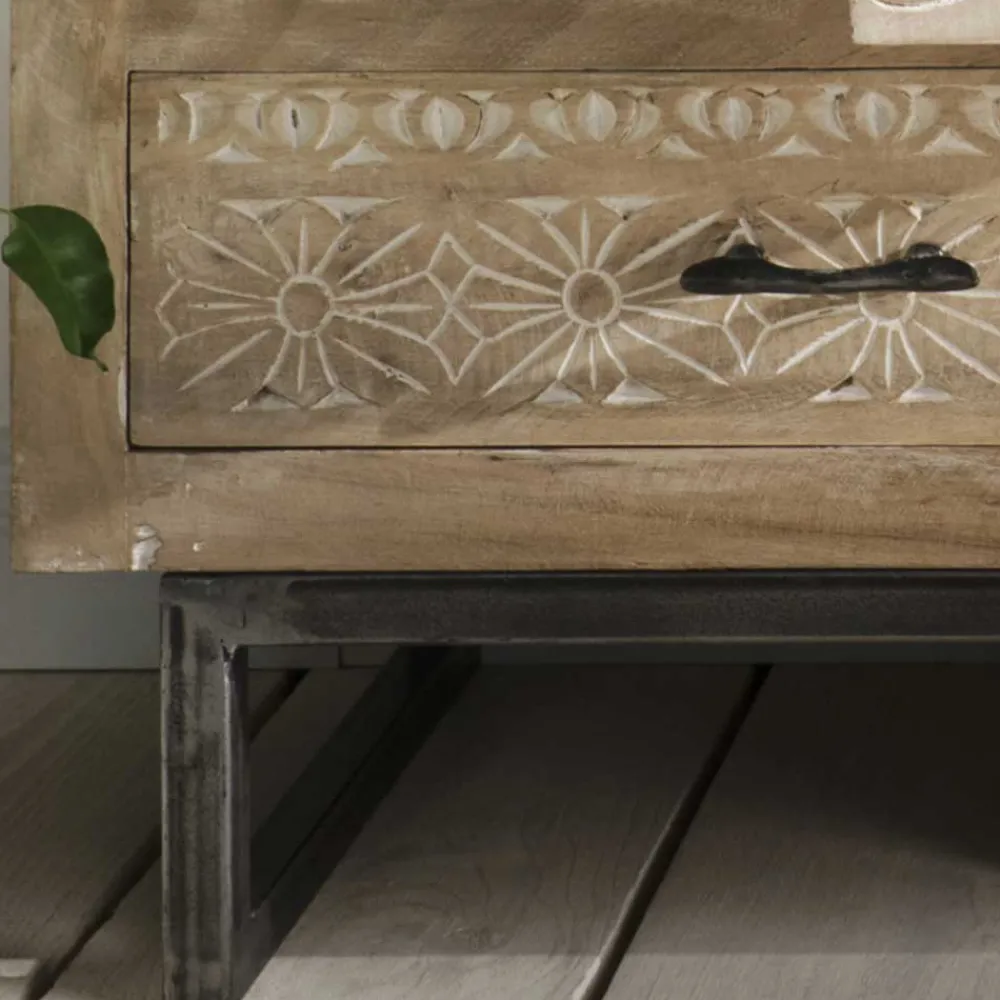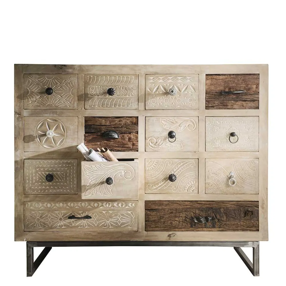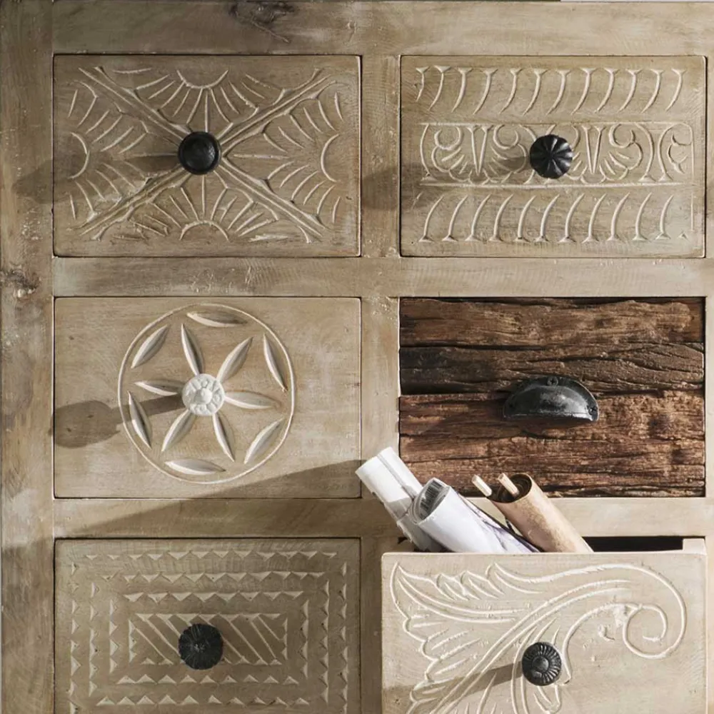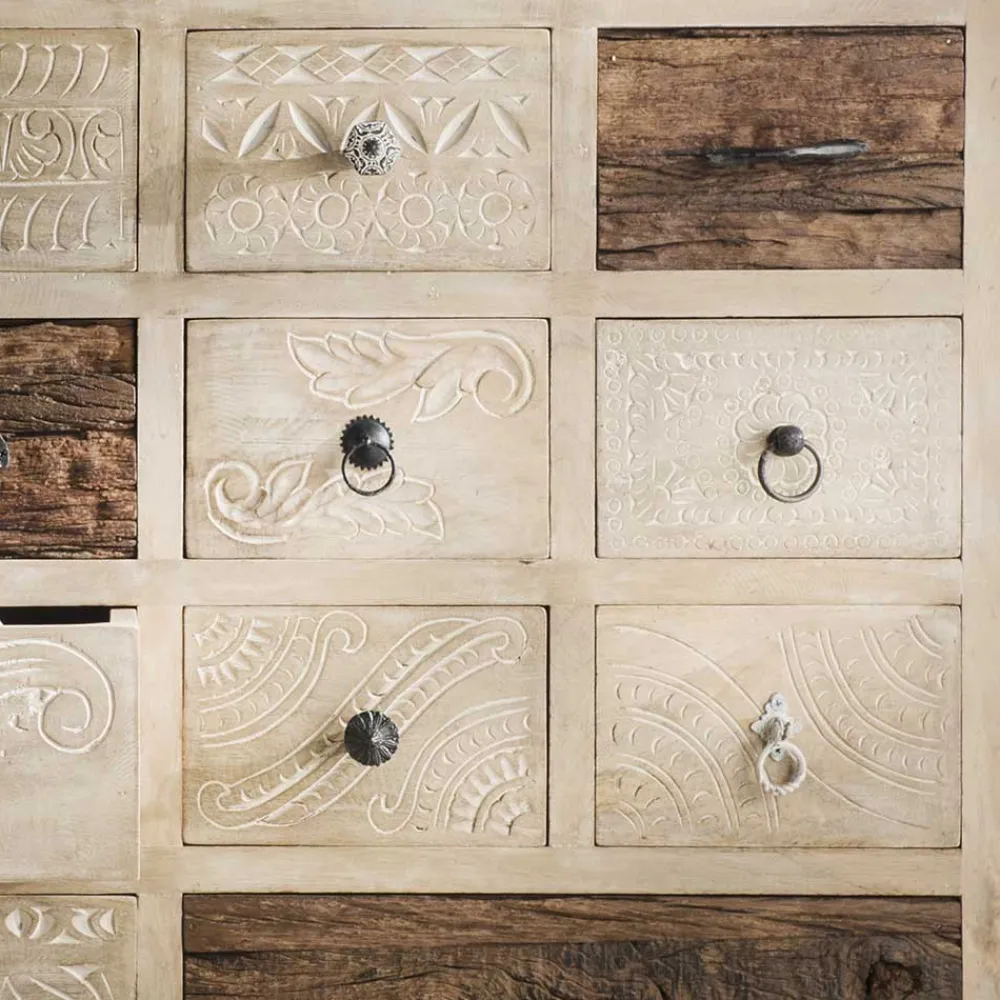 Die Holzoberfläche des Highboards ist mit einem White Wash Effekt behandelt, der dem Möbelstück eine zeitlose Eleganz verleiht. Die Schubladenfronten sind größtenteils mit wunderschönen Schnitzereien verziert, die das Highboard „Emirello“ zu einem wahren Kunstwerk machen.Der außergewöhnliche Look des Highboards „Emirello“ wird sicherlich alle Blicke auf sich ziehen und Ihrem Zuhause eine warme und einladende Atmosphäre verleihen.