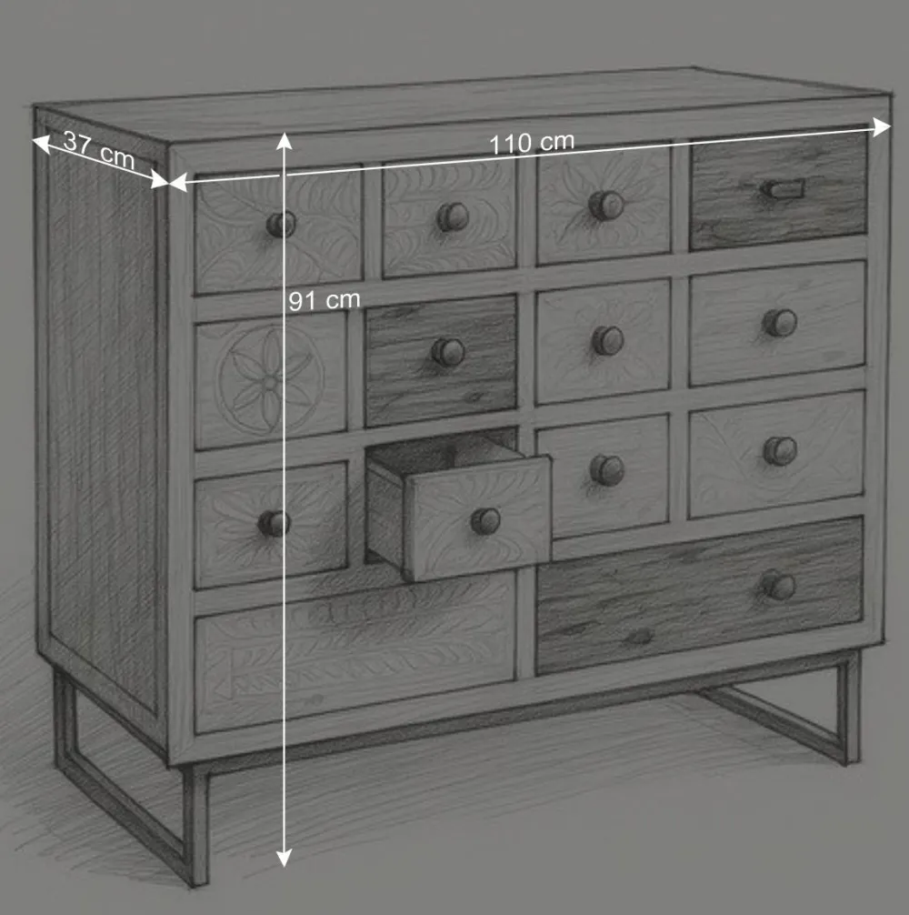 Unsere Möbel werden mit höchster Sorgfalt und Präzision gefertigt. Das Highboard „Emirello“ bietet Ihnen mit seinen 14 Schubladen in zwei unterschiedlichen Größen auf Holzauszügen eine großzügige Aufbewahrungsmöglichkeit. Die verschiedenen Knopf-, Muschel-, Ring- und Bügelgriffe aus Metall verleihen diesem Möbelstück zusätzlichen Charme.