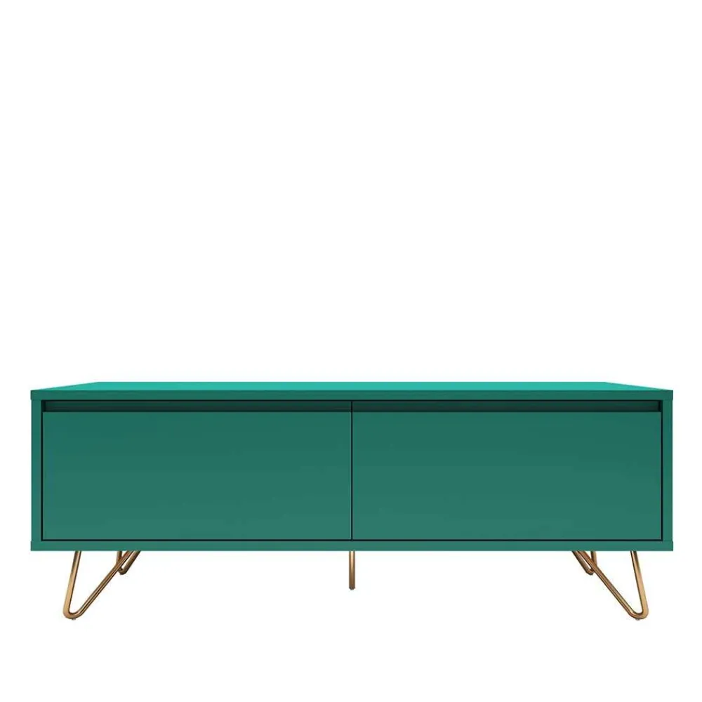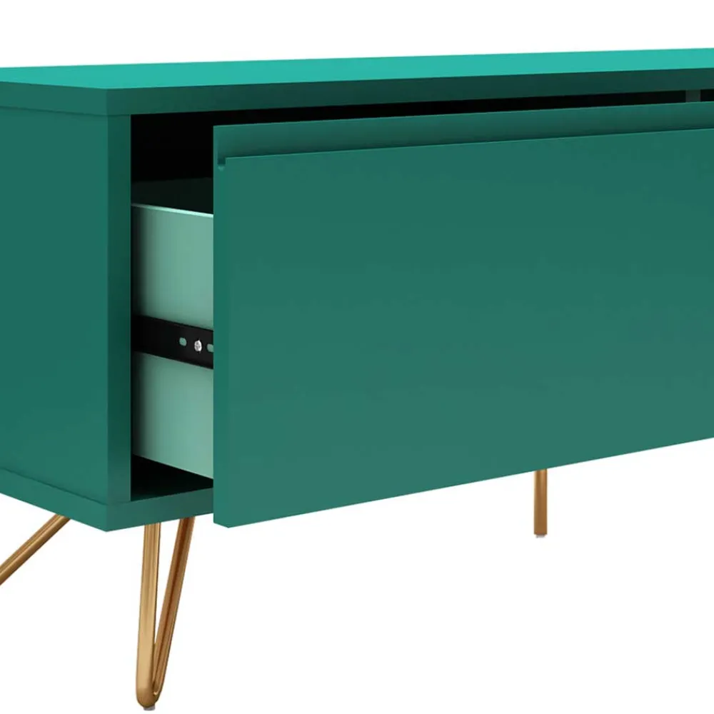 Die grifflose Optik, erzielt durch ausgefräste Griffmulden, verleiht dem Möbelstück eine moderne, puristische Anmutung. Stilvoll abgerundet wird das Design durch das Fußgestell in Bügelform, gefertigt aus Metall mit einer goldfarbenen Messinglegierung, welches einen ansprechenden Kontrast zum grünen Korpus bildet.