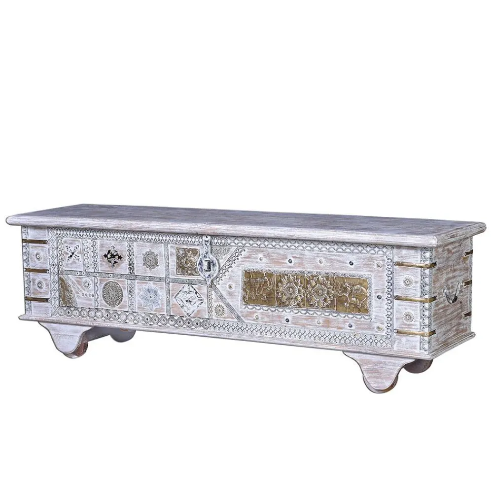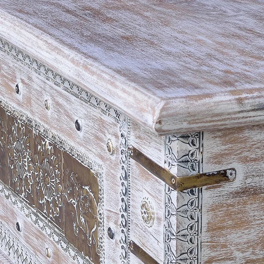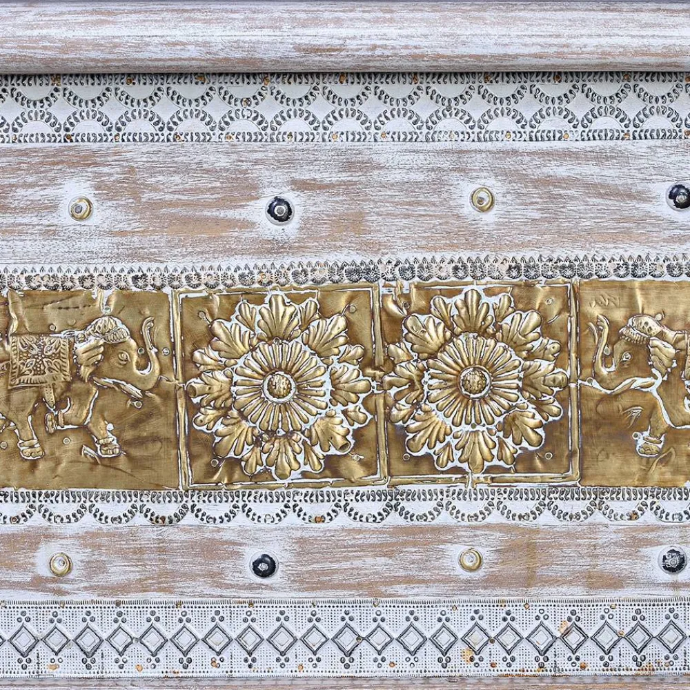 Die Truhe „Abraham“ vereint kunstvolle Handwerkskunst mit praktischer Funktionalität und bringt orientalisches Flair in Ihr Zuhause. Mit einer beeindruckenden Breite von 146 cm bietet sie nicht nur großzügigen Stauraum, sondern begeistert auch durch ihre außergewöhnliche Gestaltung. In Antikweiß gehalten und mit edlen Bronzedetails versehen, ist dieses Möbelstück ein wahres Schmuckstück für Wohn- oder Schlafzimmer. Aufwendig verzierte Oberflächen mit Ornamenten, floralen Mustern und anmutigen Elefantenmotiven machen jede Truhe zu einem Unikat – individuell gefertigt in sorgfältiger Handarbeit.