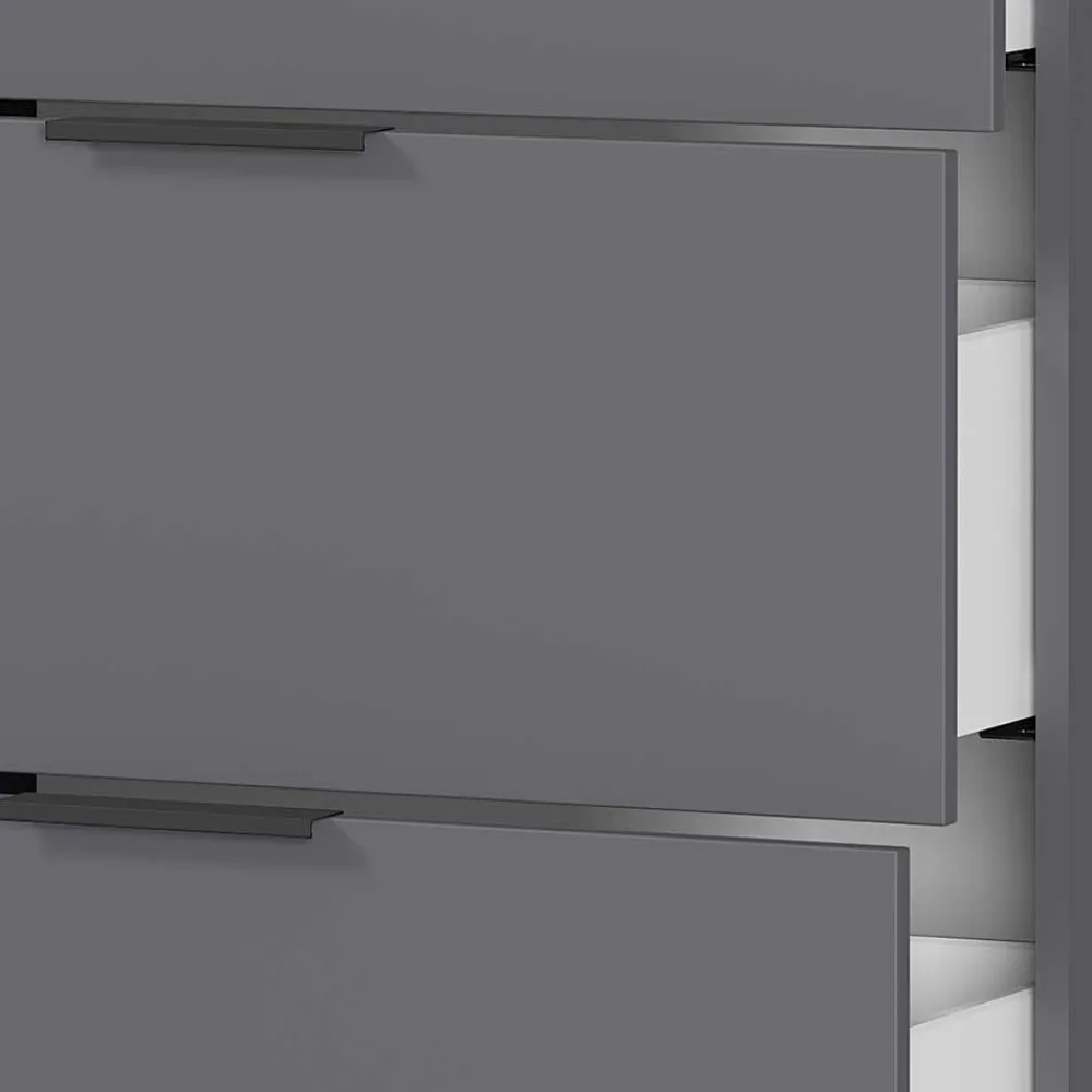 Die „Lurys“ Kommode besteht aus hochwertiger Spanplatte, die nicht nur besonders langlebig, sondern auch pflegeleicht und wasserabweisend dank der melaminbeschichteten Oberfläche in Dunkelgrau ist. Diese Beschichtung schützt die Kommode effektiv vor alltäglichen Belastungen und erleichtert die Reinigung erheblich. Ein kurzer Wisch mit einem feuchten Tuch – und die Oberfläche strahlt wieder in vollem Glanz. Durch die zusätzliche ABS-Kantenverstärkung bleibt die Kommode zudem stoß- und kratzfest – perfekt für den täglichen Gebrauch.
