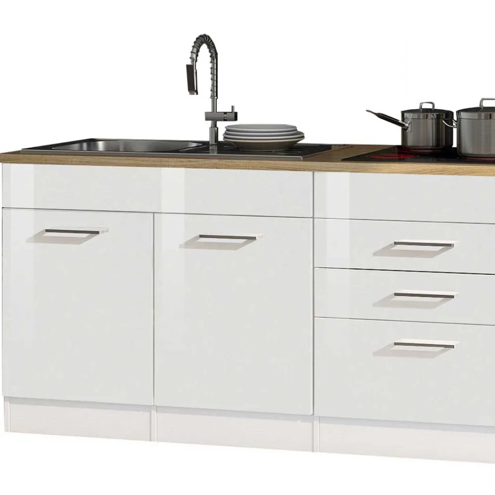 MDF, das Material der Fronten, ist bekannt für seine hohe Formstabilität und Beständigkeit. Diese mitteldichte Faserplatte (MDF) bietet eine glatte und homogene Oberfläche, die perfekt für die Verarbeitung mit Hochglanzfolien geeignet ist. Der Vorteil der Hochglanzfolierung liegt nicht nur in der edlen Optik, sondern auch in der pflegeleichten Handhabung. Die glänzenden Fronten reflektieren das Licht und verleihen Ihrer Küche eine moderne, helle Ausstrahlung. Zudem schützt die Folierung zuverlässig vor Feuchtigkeit und erleichtert die Reinigung – ideal für den intensiven Küchenalltag.