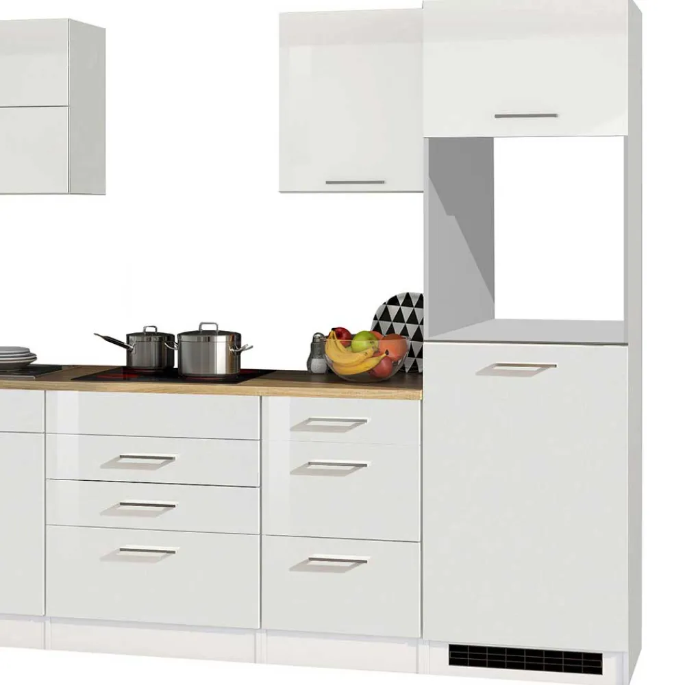 Klare Linien, schlichte Eleganz und hochwertige Materialien prägen das moderne Design der Küchenzeile „Cuneo“. In Weiß und Sonoma Eiche gestaltet, bringt diese Küche stilvolle Akzente in Ihr Zuhause. Die Hochglanzfronten in strahlendem Weiß wirken besonders edel und verleihen der Küche eine helle, freundliche Atmosphäre. Die Arbeitsplatte in Sonoma Eiche Holzoptik setzt einen warmen, natürlichen Kontrast und schafft eine gemütliche Umgebung zum Kochen und Genießen.