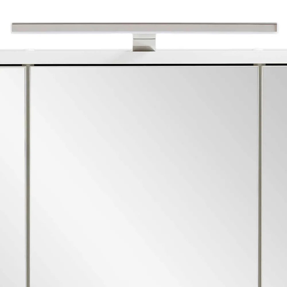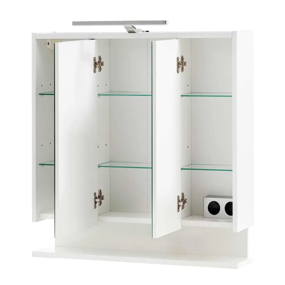 Sie können zwischen Modellen mit einer Breite von 65 cm, 75 cm oder 94 cm wählen. Alle Varianten verfügen über eine großzügige Spiegelfläche, die in drei Türen unterteilt ist. Die Türen lassen sich durch leichten Druck nach innen öffnen, wodurch Griffe überflüssig werden und ein modernes, griffloses Design entsteht.