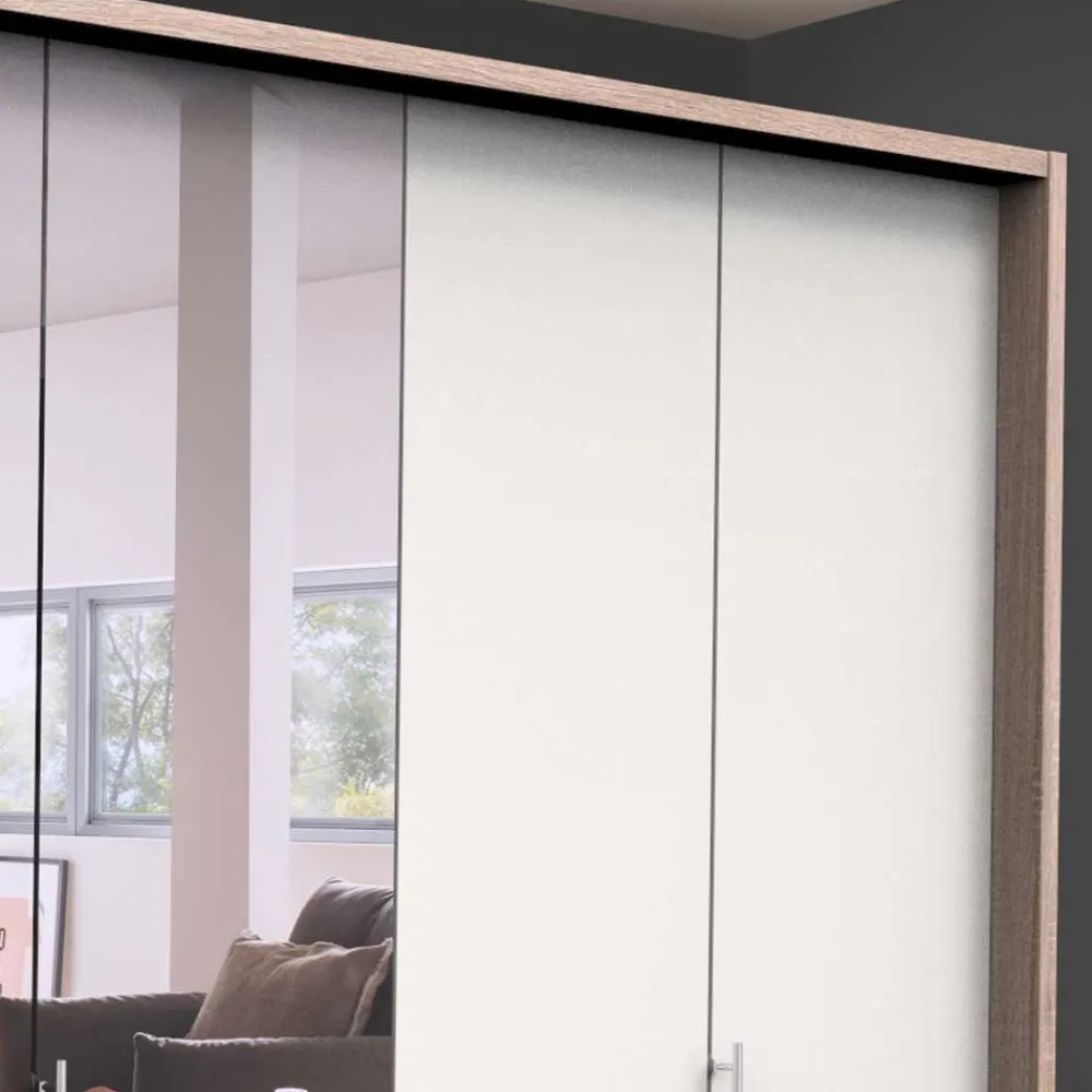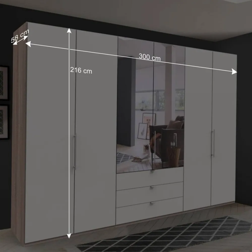 „Vaclyn“ überzeugt nicht nur durch seine außergewöhnliche Optik, sondern auch durch seine klare Formensprache. Mit seiner Breite von 300 cm, Tiefe von 58 cm und Höhe von 216 cm (oder 307 cm breit und 220 cm hoch, inklusive dem optional erhältlichen Passepartout-Rahmen) bietet der Schrank reichlich Stauraum für Ihre Kleidung und Accessoires. Die drei Panorama-Falttüren im Sechs-Türen-Look sind besonders platzsparend, da sie einfach nach vorne gezogen werden.