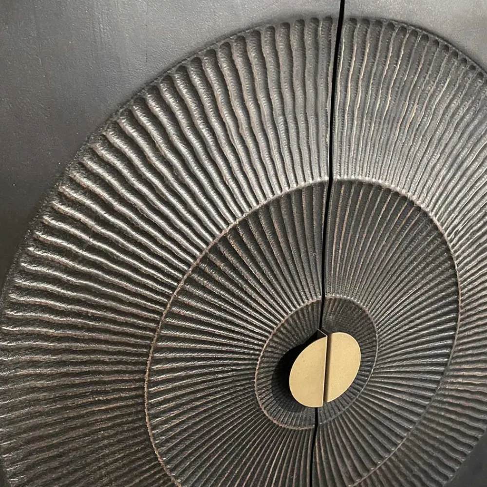 Besonders hervorzuheben sind die mittleren beiden Türfronten, die von Hand beschnitzt sind. Sie präsentieren ein plastisches Sonnenmotiv mit leichten Goldakzenten. Da jedes Stück ein Unikat ist, können Abweichungen vom Foto in Struktur und Farbe vorkommen. Diese individuellen Merkmale machen jedes Sideboard zu einem einzigartigen Kunstwerk, das Ihrem Zuhause eine persönliche Note verleiht.