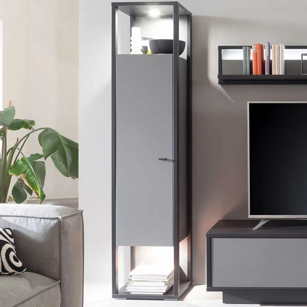 Die kleine Metall-Griffleiste in Schwarzgrau unterstreicht das moderne Design und erleichtert das Öffnen der Tür. Zwei offene Fächer bieten zusätzlichen Raum für Bücher oder Dekoartikel. Für ein besonderes Ambiente können diese Fächer optional mit einem 2er Set LED-Unterbau-Spots ergänzt werden, die eine stimmungsvolle Beleuchtung und einen modernen Touch bieten.
