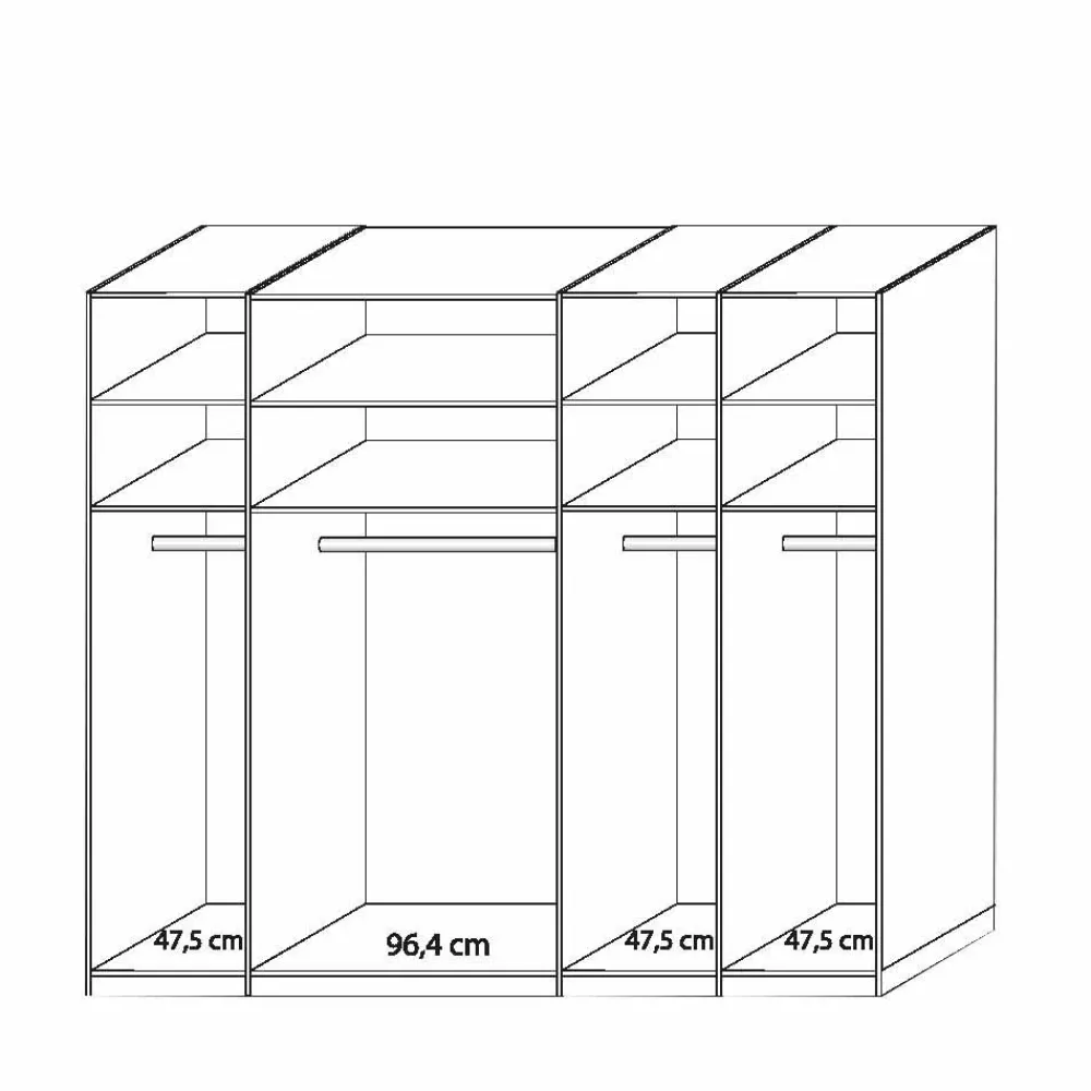 Mit einer beeindruckenden Breite von 257 cm, einer Höhe von 220 cm und einer Tiefe von 58 cm bietet der Kleiderschrank „Anglesia“ nicht nur viel Platz, sondern auch eine durchdachte Innenaufteilung. Vier großzügige Facheinheiten, jede mit zwei Einlegeböden und einer Kleiderstange, ermöglichen eine übersichtliche und ordentliche Aufbewahrung Ihrer Kleidung und Accessoires. Die Innenausstattung in grau-weißem Streifendekor setzt dabei einen zusätzlichen optischen Akzent und unterstreicht das moderne Design.