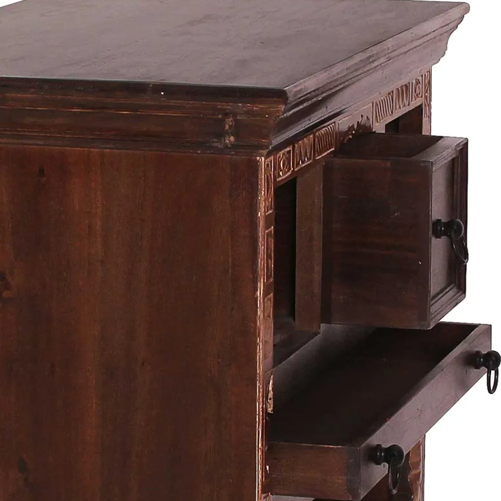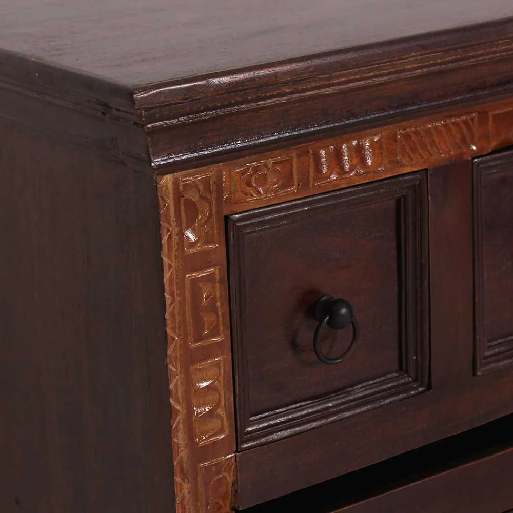 In reiner Handarbeit hergestellt, begeistert der „Solapura“ durch seine filigranen Holzschnitzereien an der Front, die farblich heller abgesetzt sind und ihm einen besonderen Charakter verleihen. Dies ist ein Zeugnis traditioneller indischer Handwerkskunst, die in jedem Detail steckt.