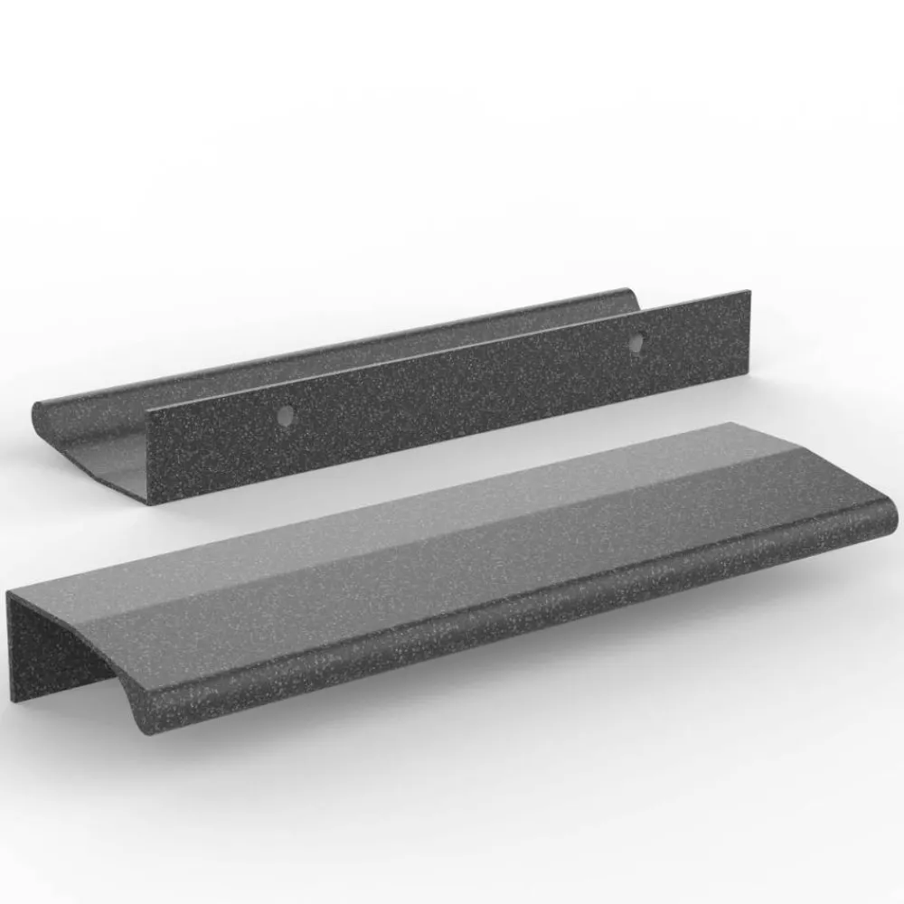 Alle acht Türen sind mit Glas im Farbton „Champagner“ beschichtet und durch horizontale Bauchbinden aus Erle-Massivholz gegliedert. Diese setzen dezente gestalterische Akzente und verleihen der Front eine klare Struktur. Der Korpus besteht aus folierter Spanplatte in Erle-Holzoptik – pflegeleicht und strapazierfähig. Schiefergraue Aluminiumgriffe und Soft-Close-Metallscharniere sorgen für komfortable Bedienung und langlebige Funktion.
