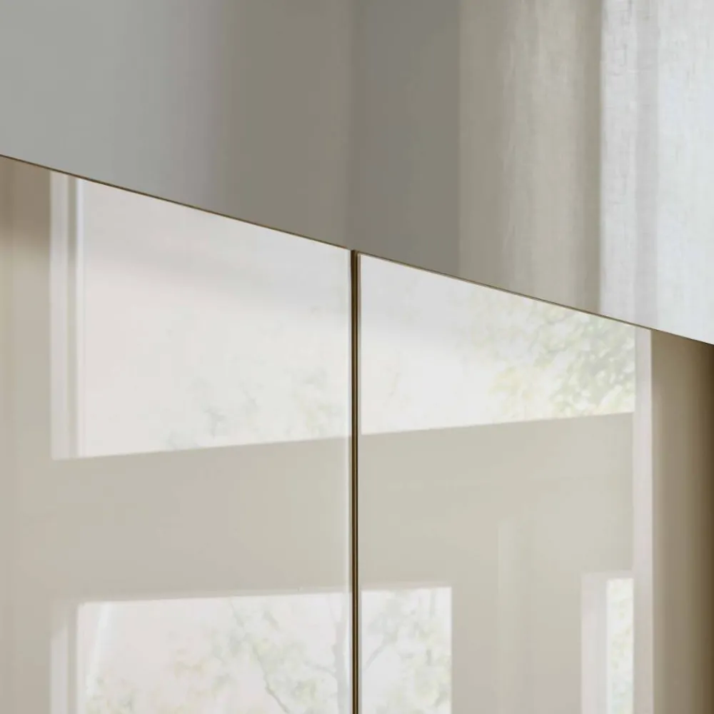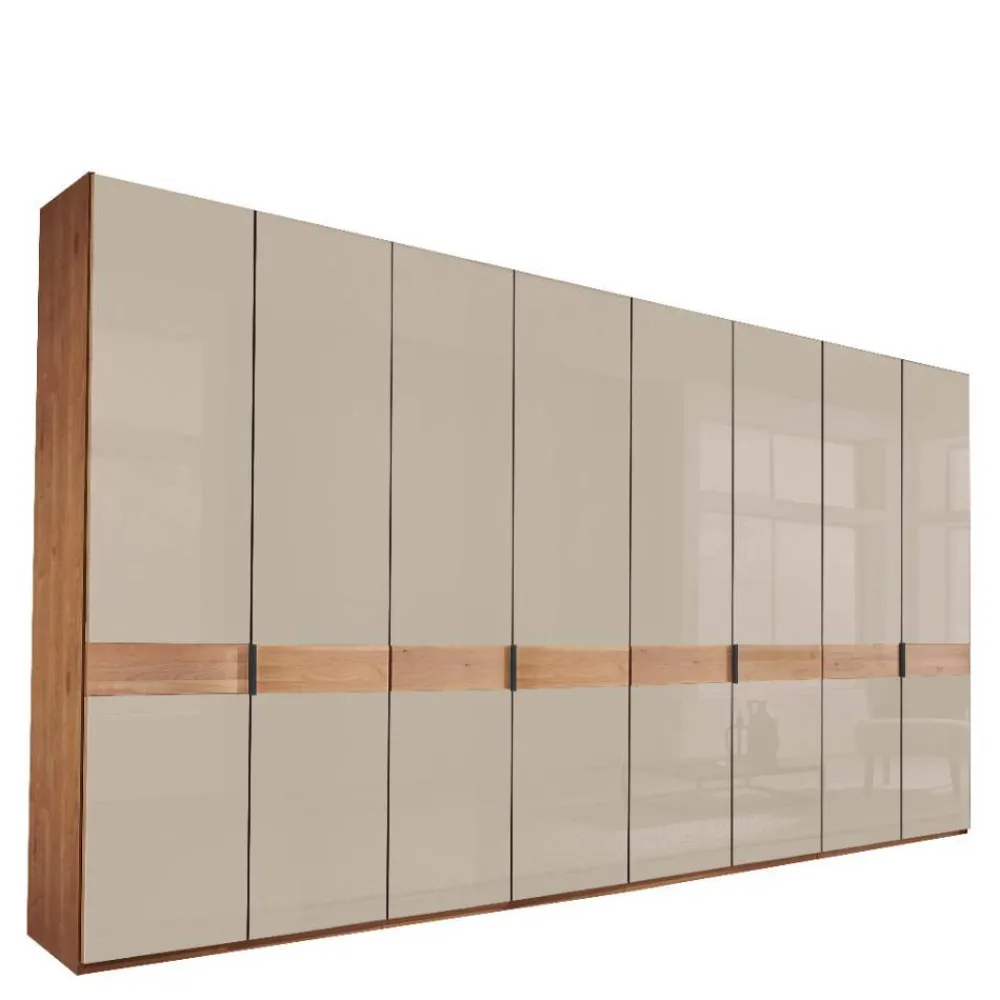 - Acht Türen aus Holzwerkstoff mit champagnerfarbiger Glasbeschichtung, Bauchbinde Massivholz, Soft Close Metallscharniere