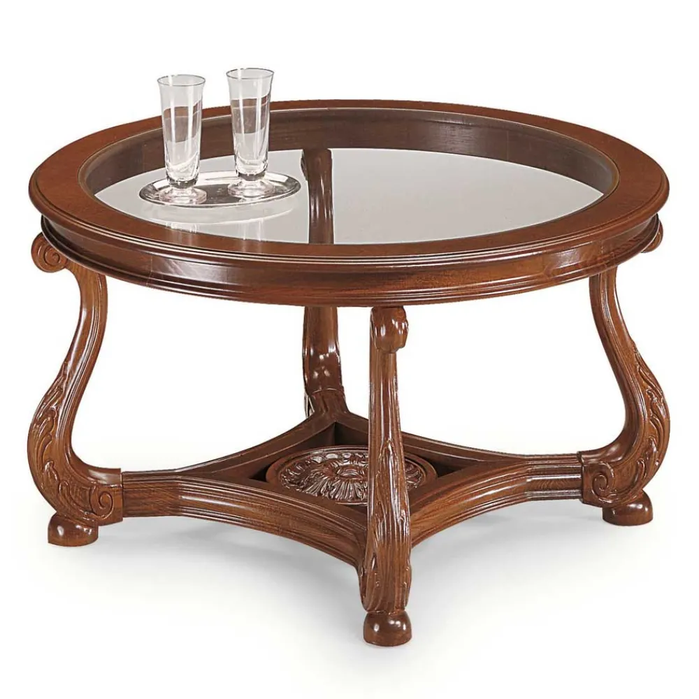 In der Mitte des Gestells zieht ein fein gearbeitetes Medaillon aus Resin die Blicke auf sich – ein kleines Kunstwerk, das dem Tisch eine ganz besondere Note verleiht. Ergänzt wird dieses Detail durch florale Schnitzungen an den Tischbeinen, die an kunstvolle Skulpturen erinnern. Diese liebevollen Akzente machen aus „Vibon“ mehr als nur einen Beistelltisch – sie machen ihn zu einem echten Schmuckstück.