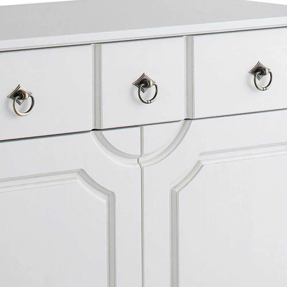 Jedes Detail des Vertiko „Vesrav“ wurde sorgfältig überlegt, um nicht nur Funktionalität, sondern auch ästhetischen Wert zu bieten. Die dekorativen Metall-Ringgriffe in Antikoptik fügen einen Hauch von Vintage-Eleganz hinzu und machen jede Interaktion mit dem Möbelstück zu einem besonderen Erlebnis. Das teilgeöffnete Sockelgestell verleiht dem Vertiko eine leichte und luftige Note, während die Empfehlung zur Wandbefestigung für zusätzliche Stabilität und Sicherheit sorgt.