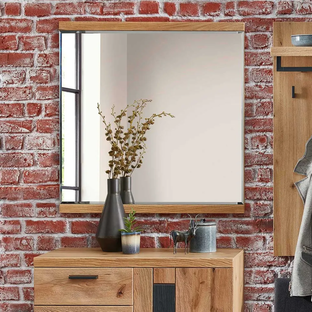 Moderne Inneneinrichtung ist gekennzeichnet durch klare Linien, schlichte Formen und eine oft minimalistische Ästhetik. Der Wandspiegel „Elprisca“ verkörpert genau diese Prinzipien. Mit seinen großzügigen Maßen von 85 cm Breite und 88 cm Höhe sowie einer schlanken Tiefe von nur 2 cm, macht dieser Spiegel sowohl in kleinen als auch in großzügigen Räumlichkeiten eine gute Figur. Die folierte Rahmenoberfläche in Wildeiche-Optik bringt Wärme und Natürlichkeit in Ihr Ambiente, ohne dabei aufdringlich zu wirken.
