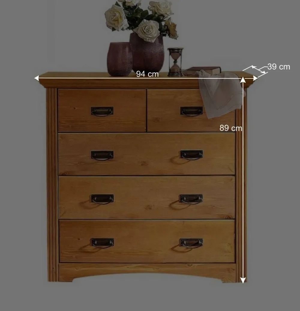 Mit fünf geräumigen Schubkästen auf Metallauszügen und Schubkastenböden aus HDF bietet die Kommode viel Stauraum für all Ihre Dinge. Nostalgisch anmutende Metallgriffe an den Schubladen runden das harmonische Gesamtbild ab.