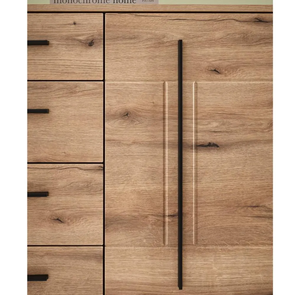 Jede Komponente dieser Wohnwand wurde mit Liebe zum Detail konzipiert: Türen und Schubladen sind mit stabilen Metallbeschlägen sowie leichtgängigen Metallauszügen ausgestattet – für ein sanftes, geräuschloses Öffnen und Schließen. Die Türanschläge sind beidseitig montierbar und ermöglichen so maximale Flexibilität bei der Raumgestaltung. Lange, schwarze Griffleisten setzen nicht nur optische Akzente, sondern liegen auch angenehm in der Hand – ein Detail, das man spürt und täglich schätzt.