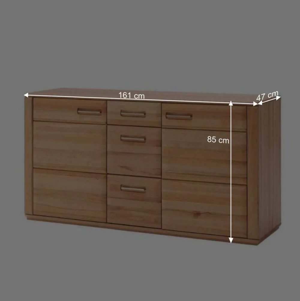 Die Front des Sideboards „Athias“ besteht aus massiver Kernbuche. Bekannt für ihre beeindruckende Härte und Dichte, bringt die Kernbuche ein robustes, langlebiges und zugleich ästhetisch ansprechendes Element in dieses Möbelstück. Der Korpus ist aus wertiger Spanplatte gefertigt und mit echtem Holzfurnier veredelt, was einen reizvollen Kontrast zur massiven Kernbuche bildet.
