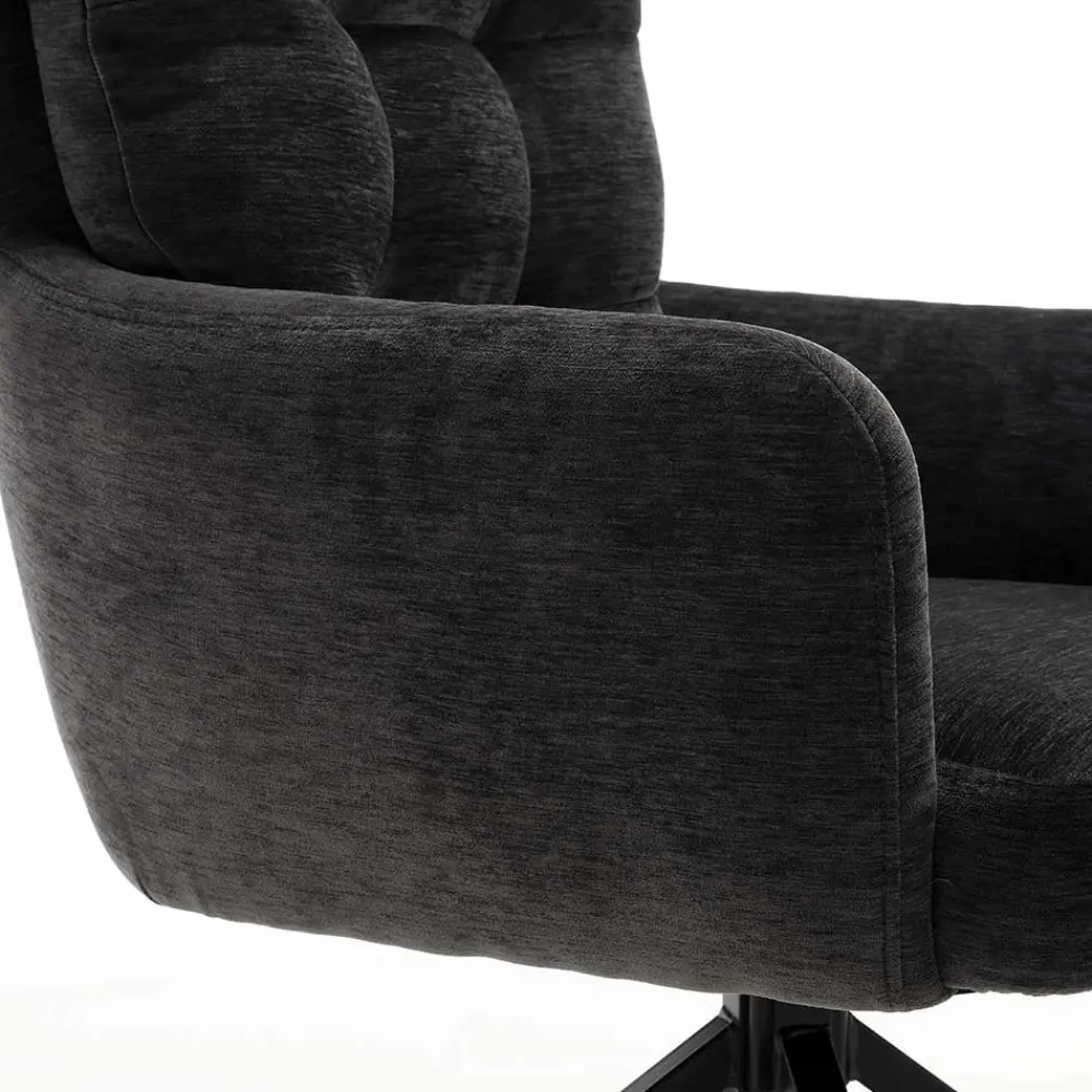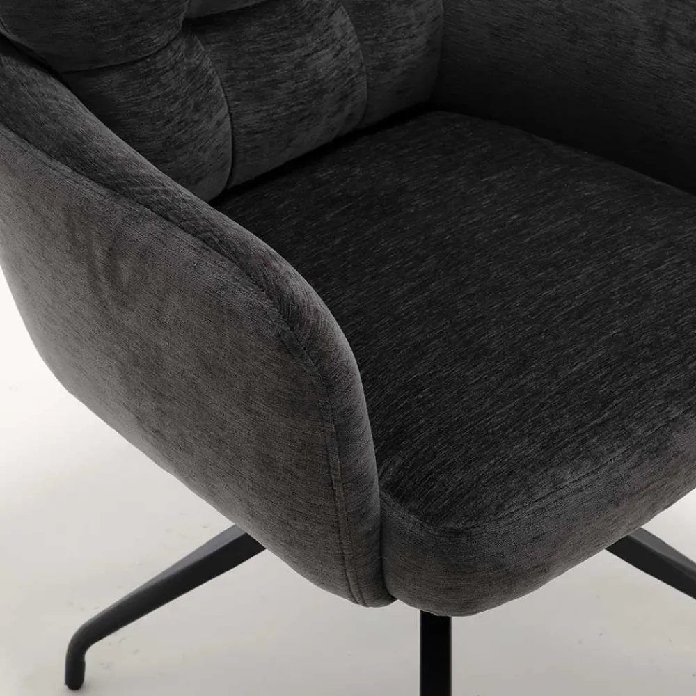 Das markante Spiderdesign des stabilen Metallgestells mit schwarzer Pulverbeschichtung setzt Akzente in jedem Raum. Dank der 180-Grad-Drehfunktion und dem Rückhol-Mechanismus ist der Stuhl „Emgo“ ideal für kleinere Räume geeignet. Er bietet eine Belastbarkeit von bis zu 120 kg und verbindet Funktionalität mit modernem Design.