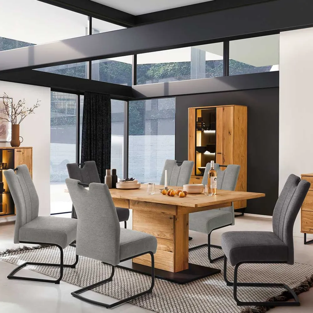 Sitzgruppe „Flacona“ verkörpert modernes Design und praktische Anwendung in einem. Jeder Aspekt dieses einzigartigen Sets, bestehend aus sechs Schwingstühlen und einem flexiblen Ausziehtisch, wurde konzipiert, um Ihrem Wohnbereich eine zeitgemäße und zugleich funktional optimierte Atmosphäre zu verleihen.