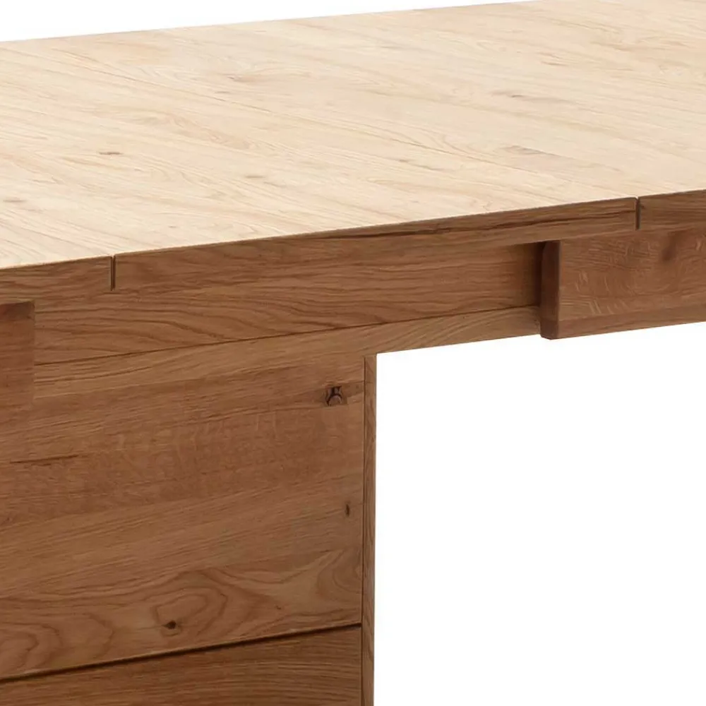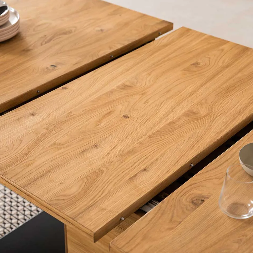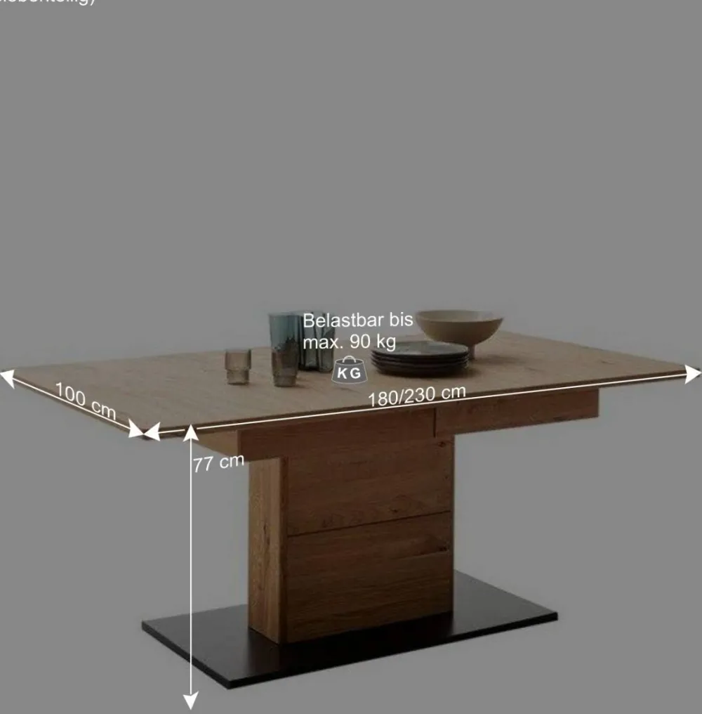 Die Tischplatte aus massiver Wildeiche, behandelt mit einem Ölfinish für Langlebigkeit und Ästhetik, steht in beeindruckendem Kontrast zum Säulengestell aus Holzwerkstoff. Unterstrichen wird diese Kombination durch eine Bodenplatte in elegantem Anthrazit. Doch nicht nur das Design überzeugt – der Tisch lässt sich spielend leicht um 50 cm erweitern, von ursprünglichen 180 cm auf großzügige 230 cm, und bietet somit Platz für zusätzliche Gäste oder kulinarische Köstlichkeiten.
