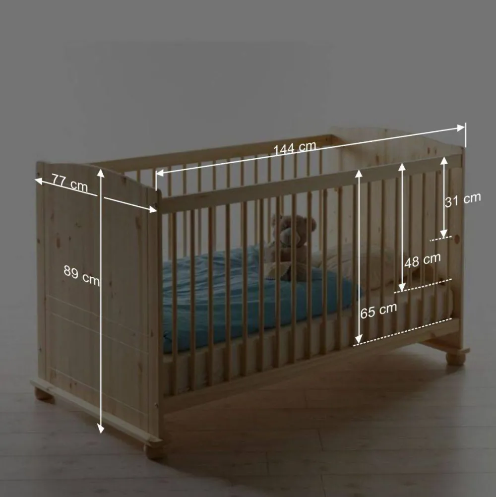 Das Babybett „Cilian“ misst 77 cm in der Breite, 89 cm in der Höhe und 144 cm in der Tiefe. Geliefert wird es zerlegt, aber dank der beiliegenden Montageanleitung lässt es sich problemlos selbst aufbauen.