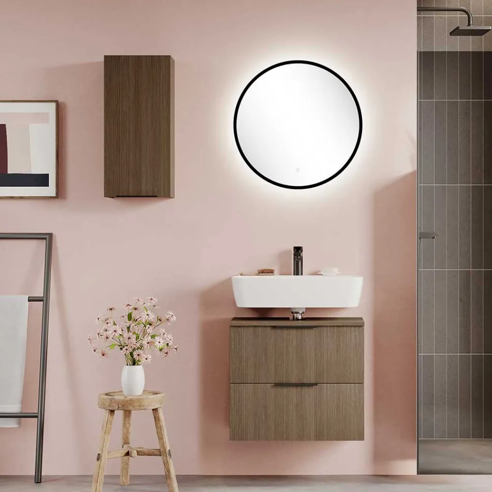 Ein Highlight dieses Sets ist zweifellos der runde Spiegel, der jedes Bad optisch vergrößert und gleichzeitig modern in Szene setzt. Integrierte LED-Leuchten sorgen für eine angenehme, blendfreie Atmosphäre, die den Raum mit sanftem Licht erfüllt und deine tägliche Pflege zu einem kleinen Ritual macht. Dank des praktischen Touchschalters direkt auf der Spiegelfläche wird die Steuerung der Beleuchtung so einfach wie nie zuvor – ein sanfter Fingertipp genügt. Der 3,5 cm tiefe Metallrahmen in matt schwarzer Lackierung wirkt stilvoll und dezent zugleich und lässt den Spiegel zur platzsparenden Wandmontage besonders geeignet erscheinen. Kleine Bäder profitieren von dieser Bauweise ebenso wie großzügige Räume, da der Spiegel funktionales Licht mit ausdrucksstarkem Design verbindet.