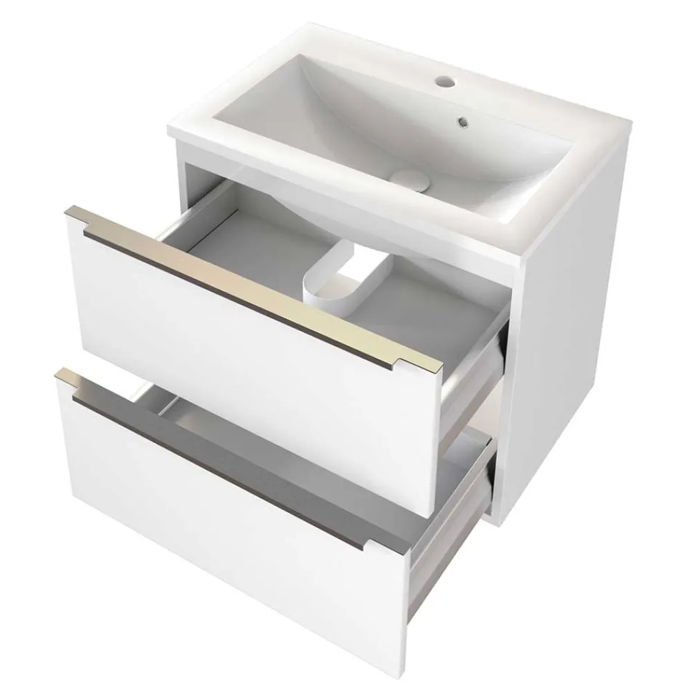 Mit Maßen von 56 cm Höhe und 47 cm Tiefe sowie wählbarer Breite zwischen 60 und 100 cm passt sich der Waschtisch „Livendas“ perfekt an unterschiedliche Raumverhältnisse an. Die Wandmontage spart wertvollen Platz und schafft eine luftige Atmosphäre. Zwei geräumige Schubladen, ausgestattet mit Metallauszügen und einer Soft-Close-Funktion, bieten nicht nur Platz, sondern auch einen leisen und sanften Gebrauch. Der integrierte Siphon-Ausschnitt in der oberen Schublade vereinfacht die Installation und Nutzung.