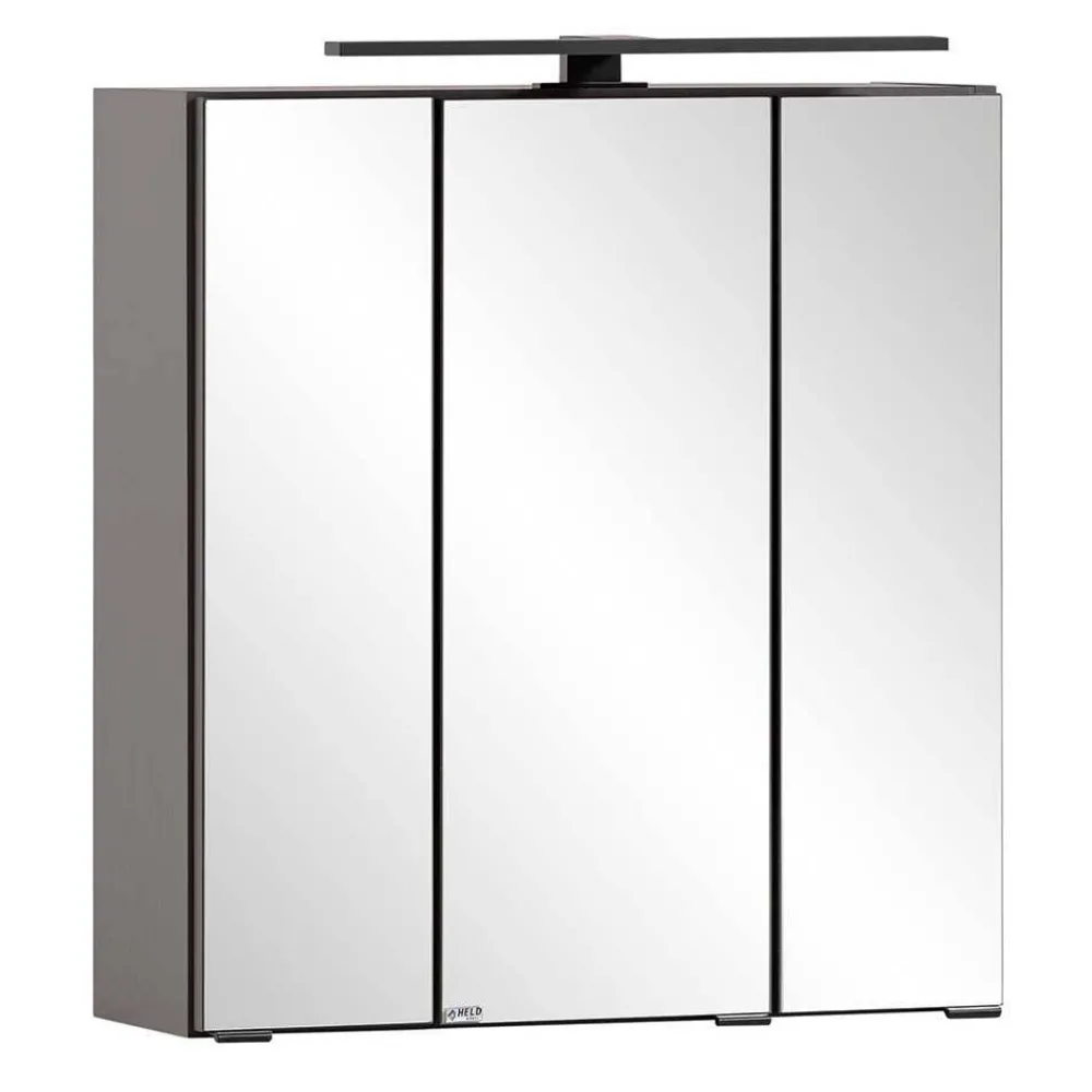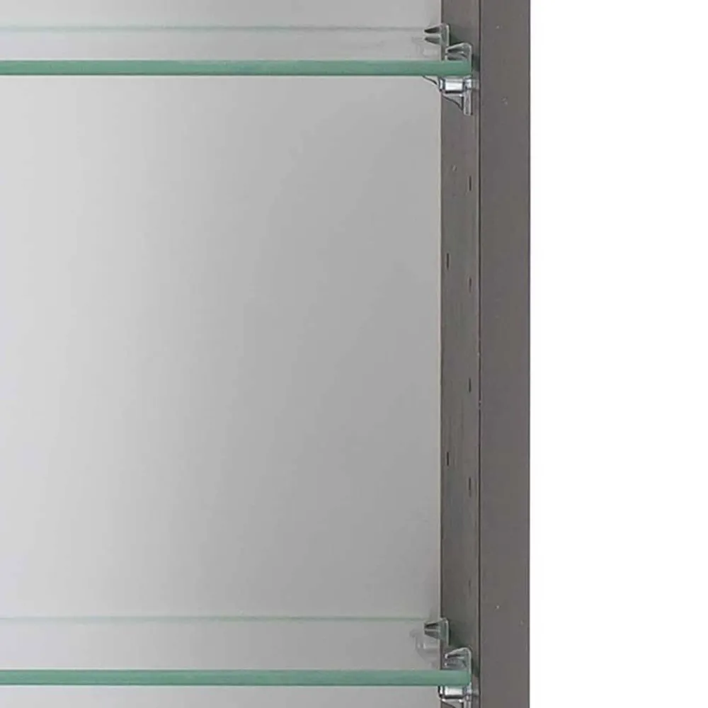 Ein Spiegelschrank mit drei Drehtüren aus Spiegelglas sorgt für ein großzügiges Stauraumangebot. Drei Fachelemente mit jeweils zwei festen Glasböden (5 mm Stärke, je bis 3 kg belastbar) halten alle Pflegeprodukte griffbereit und ordentlich. Die integrierte LED-Beleuchtung mit 700 Lumen, einer Farbtemperatur von 4000 Kelvin in warmweißer Lichtfarbe und einer Leistung von 9,6 Watt schafft eine perfekte Ausleuchtung. Eine Steckdose und ein Schalter im Schrank ermöglichen das Anschließen von Rasierer oder Föhn direkt an Ort und Stelle. Kleine schwarze Metallgriffe an den Türunterkanten ergänzen das elegante Design.