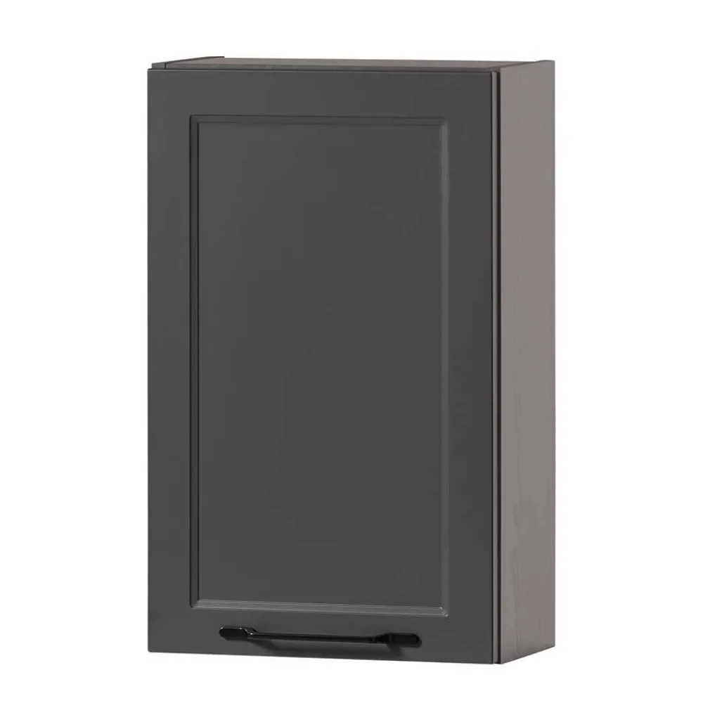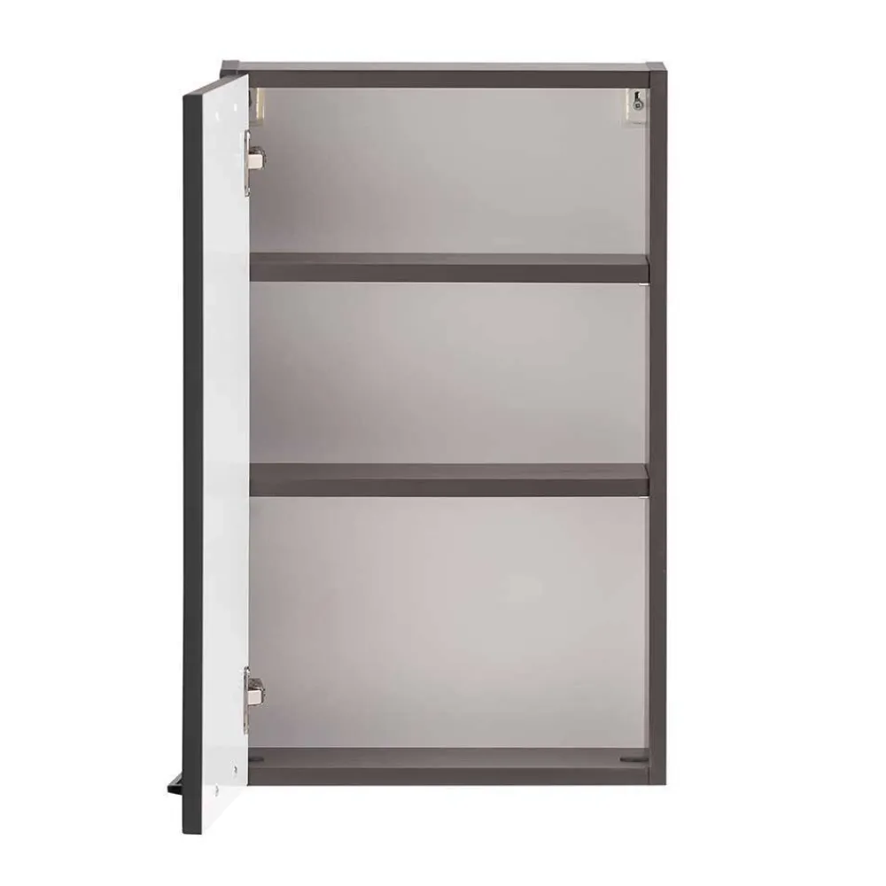 Ein Oberschrank mit beidseitig montierbarem Türanschlag bietet maximale Flexibilität bei der Montage. Gedämpfte Metallbeschläge und Soft-Close-Funktion sorgen dafür, dass die Tür sanft und nahezu geräuschlos schließt – ein Pluspunkt für Langlebigkeit und Komfort. Zwei Einlegeböden bieten Platz für Handtücher, Pflegeprodukte oder Kosmetik. Schwarze Metall-Bügelgriffe unterstreichen den hochwertigen Charakter des Möbels.