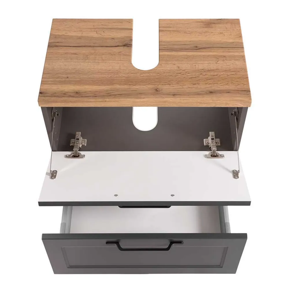 Ein Waschbeckenschrank mit einer 2,5 cm starken Deckplatte und integriertem Siphonausschnitt erleichtert die Installation Ihres individuell gewählten Waschbeckens (nicht inklusive) und sorgt dafür, dass der Siphon optisch elegant verborgen bleibt. Hinter einer gedämpften Klappe verbirgt sich ein großes Fach für größere Utensilien. Eine darunterliegende Schublade mit Metallauszug und Soft-Close-Funktion bietet weiteren Stauraum und lässt sich besonders sanft und leise schließen. Eine teilgeöffnete Rückwand erleichtert die Installation, während schwarze Metall-Bügelgriffe eine komfortable Handhabung sicherstellen.