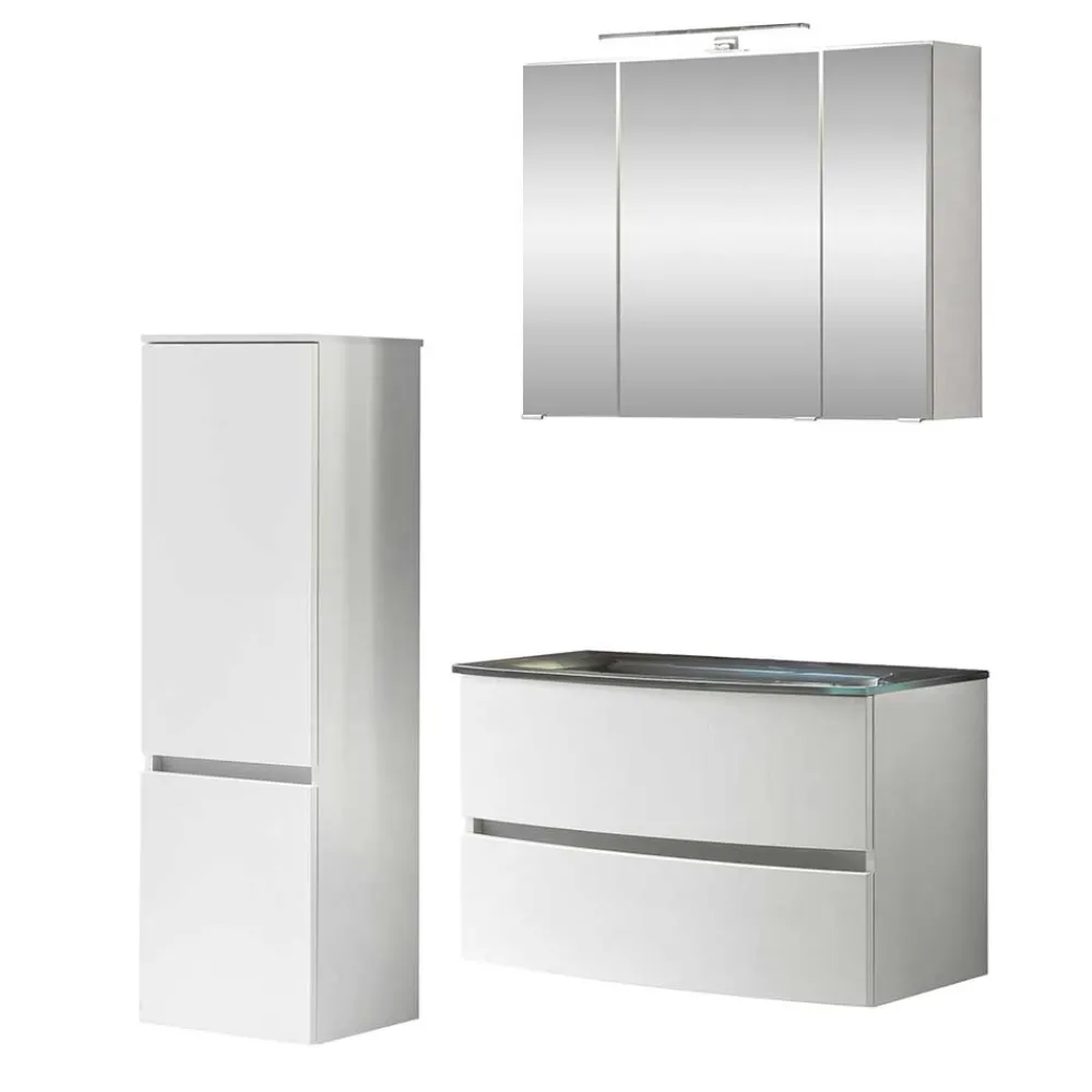 Der Spiegelschrank des Sets zeichnet sich durch seine sparsame LED-Aufsatzleuchte in Chromfarben aus, die Ihr Badezimmer in ein angenehmes Licht taucht. Hinter den drei Türen verbergen sich verstellbare Glasböden, die genügend Platz für all Ihre Badutensilien bieten. Die integrierte Trafobox mit Lichtschalter und Steckdose macht diesen Schrank nicht nur optisch ansprechend, sondern auch äußerst praktisch.