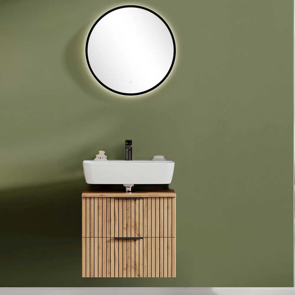 Die Möbel bestehen aus strapazierfähiger Spanplatte und hochwertigem Spiegelglas – Materialien, die sich im Alltag bewähren und optisch überzeugen. Die Fronten des Unterschranks sind in charakteristischer Rillenoptik gestaltet, die dem Möbel Tiefe und Struktur verleiht, während der schwarze Hintergrund Eleganz und Ruhe ausstrahlt. Abgerundet wird das Ganze durch mattschwarz lackierte Metall-Kantengriffe, die perfekt ins Designkonzept passen. Die ausgezeichnete Materialqualität zieht sich durch jedes Detail – für dauerhafte Freude an Ihrer neuen Badeinrichtung.