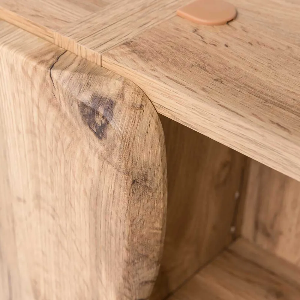 - Oberflächen in Holzoptik Wildeiche foliert, Kanten tiefgezogen (Front) und melaminbeschichtet (Korpus), Touchwood, Innendekor weiß