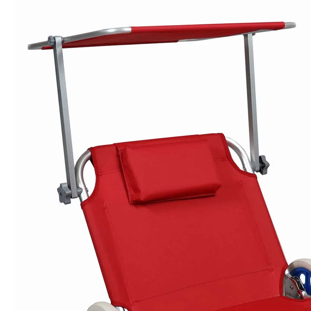 - Dieser moderne Liegestuhl ist in den Farben Rot und Silberfarben gehalten