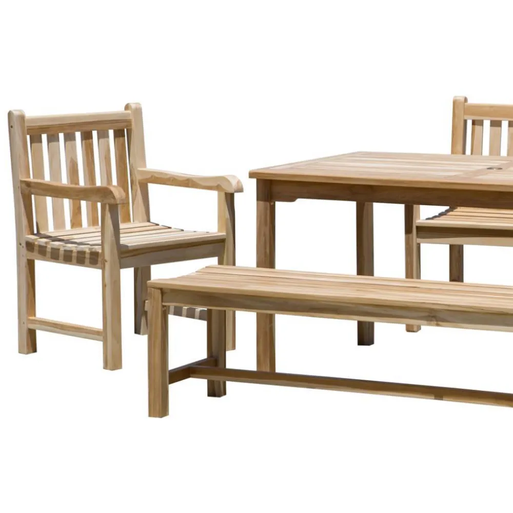 Gefertigt aus hochwertigem Teak-Massivholz überzeugt die Gruppe nicht nur optisch, sondern auch durch ihre besonderen Materialeigenschaften. Teak zählt zu den edelsten Hölzern für den Außenbereich, da es von Natur aus reich an Ölen ist. Diese verleihen dem Holz eine hohe Widerstandsfähigkeit gegenüber Feuchtigkeit, Schädlingen und Temperaturschwankungen. So bleibt die Sitzgruppe über viele Jahre hinweg stabil und attraktiv. Die unbehandelten Oberflächen entwickeln mit der Zeit eine edle, silbergraue Patina – ein natürlicher Alterungsprozess, der den Möbeln zusätzlichen Charakter schenkt.