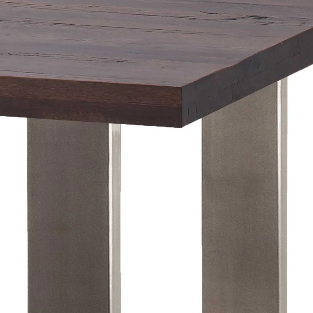 Warmes Eichenholz in verwitterter Optik bildet das Zentrum dieses exklusiven Bartisches. Durch die lebendige Maserung, leichte Farbunterschiede und bewusst belassene Unregelmäßigkeiten wie Risse, Astlöcher oder Vertiefungen entsteht ein echtes Naturerlebnis. Unterstützt wird diese rustikale Anmutung durch das kühl glänzende Gestell in edlem Silber. Die Mischung aus warmem Holzton und kühler Metallfarbe schafft eine ausdrucksstarke, harmonische Atmosphäre – modern, ohne kühl zu wirken.