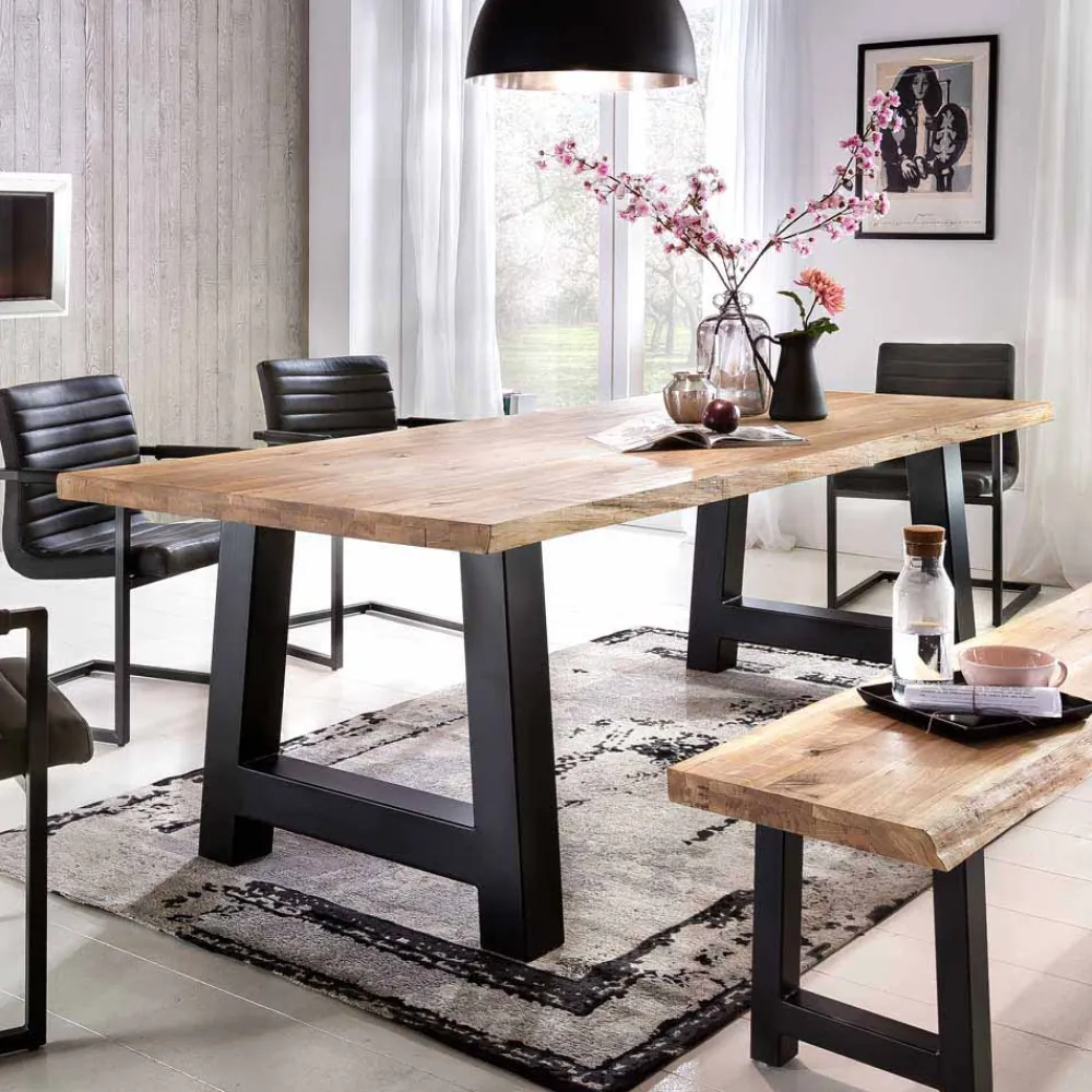 Hergestellt aus massivem Eichenholz, steht der Tisch nicht nur für eine beeindruckende Optik, sondern auch für Langlebigkeit und Robustheit. Eichenholz ist bekannt für seine Härte und Widerstandsfähigkeit, was den „Morienta“ Tisch zu einem langlebigen Begleiter macht. Es besitzt eine markante Maserung, die jedem Exemplar ein unverwechselbares Aussehen verleiht. Ergänzt wird die natürliche Schönheit des Holzes durch ein robustes Gestell aus schwarzem Eisen, das nicht nur für Stabilität sorgt, sondern auch den industriellen Charakter unterstreicht.