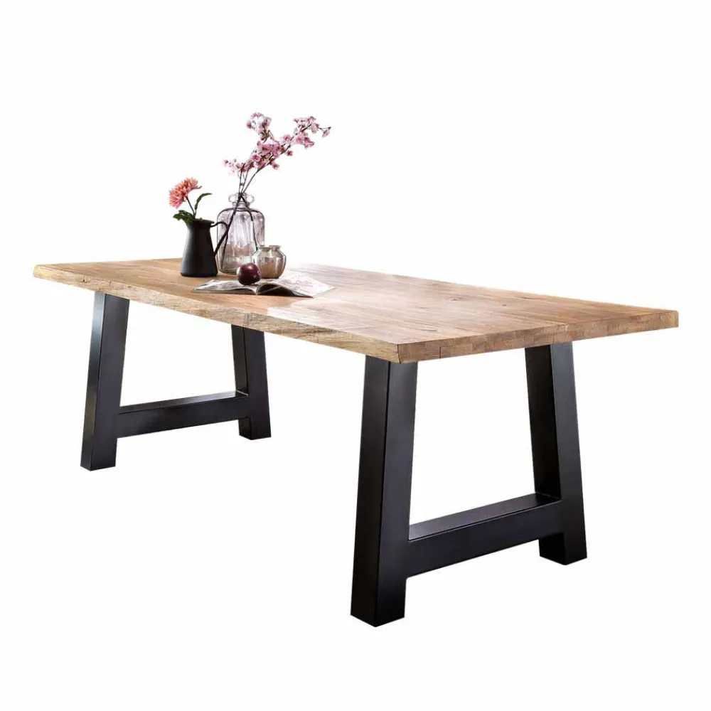 Mit einer Höhe von 77 cm und wählbaren Breiten zwischen 180 cm und 220 cm passt sich der „Morienta“ Tisch flexibel an verschiedene Raumgrößen und Stile an. Die solide Tischplatte aus massivem Eichenholz zeigt mit einer Stärke von ca. 2 cm und am Rand aufgedoppelt auf ca. 4,5 cm, dass hier Wert auf Qualität und sorgfältige Verarbeitung gelegt wurde. Das A-Form Gestell aus pulverbeschichtetem Eisen garantiert nicht nur Standfestigkeit, sondern fügt sich auch harmonisch in das Gesamtbild ein.