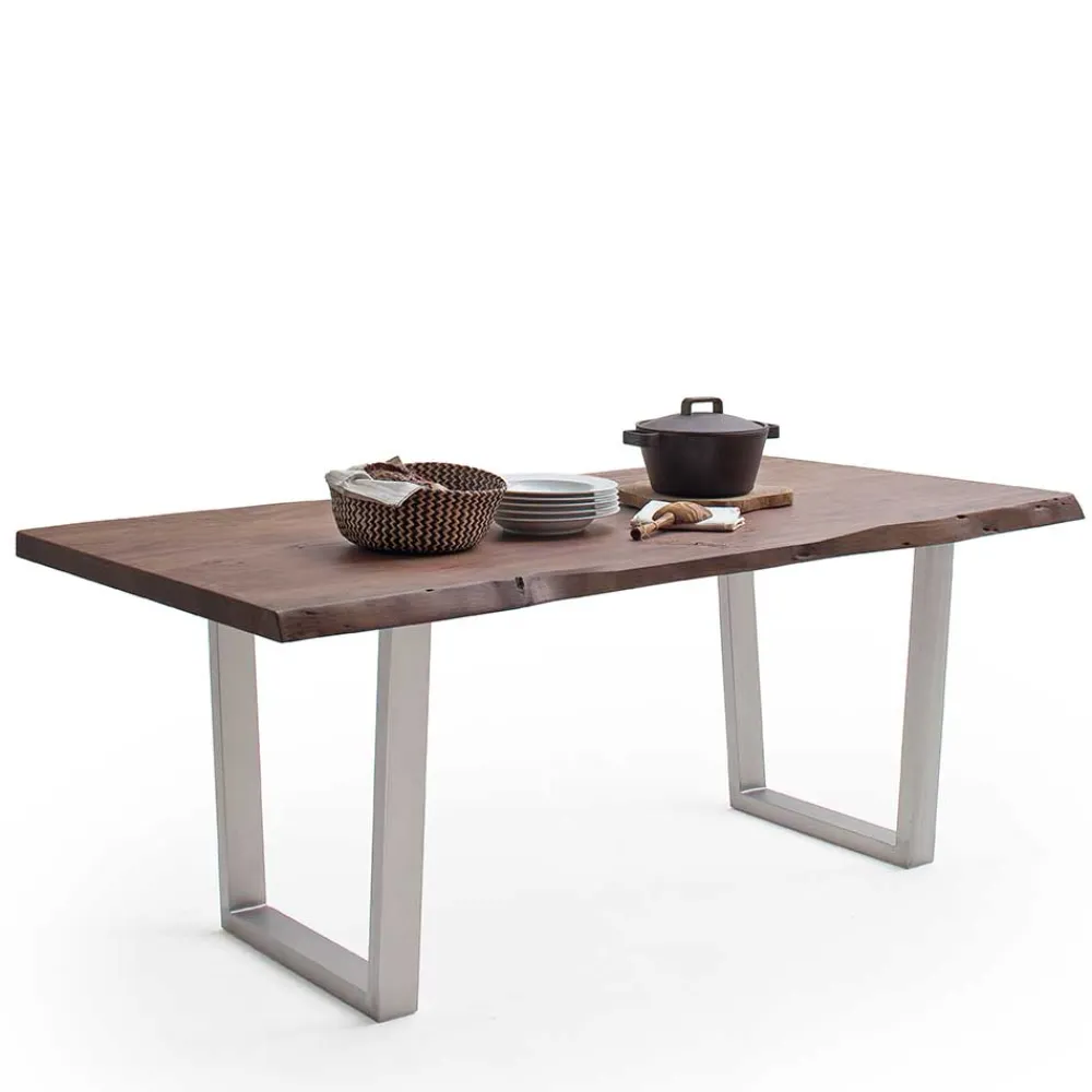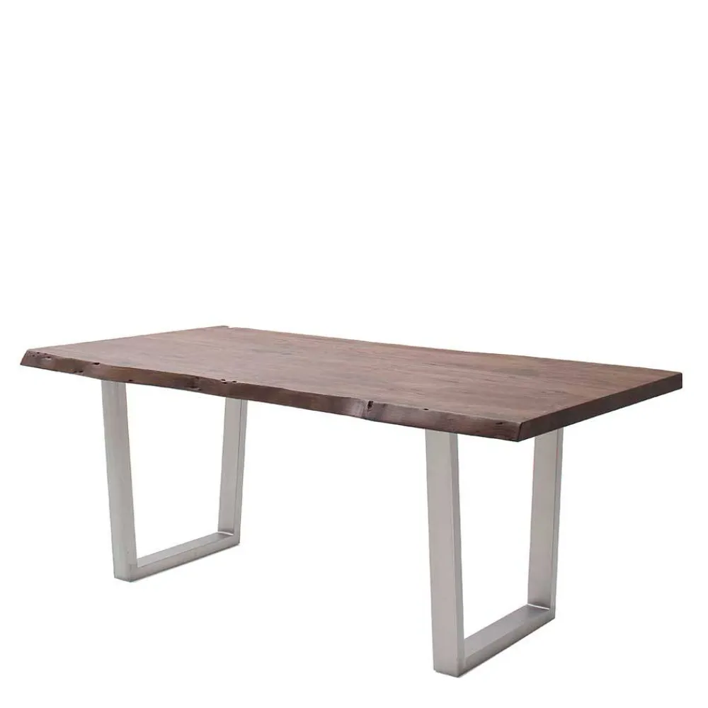 Der Baumkanten-Tisch „Bennetto“ vereint rustikale Gemütlichkeit mit modernem Design und wird so zum Herzstück Ihres Essbereichs. Mit seiner warmen Walnuss-Braun-Färbung und den edelstahlfarbenen Akzenten fügt sich dieser Tisch harmonisch in jede Einrichtung ein und schafft eine einladende Atmosphäre.