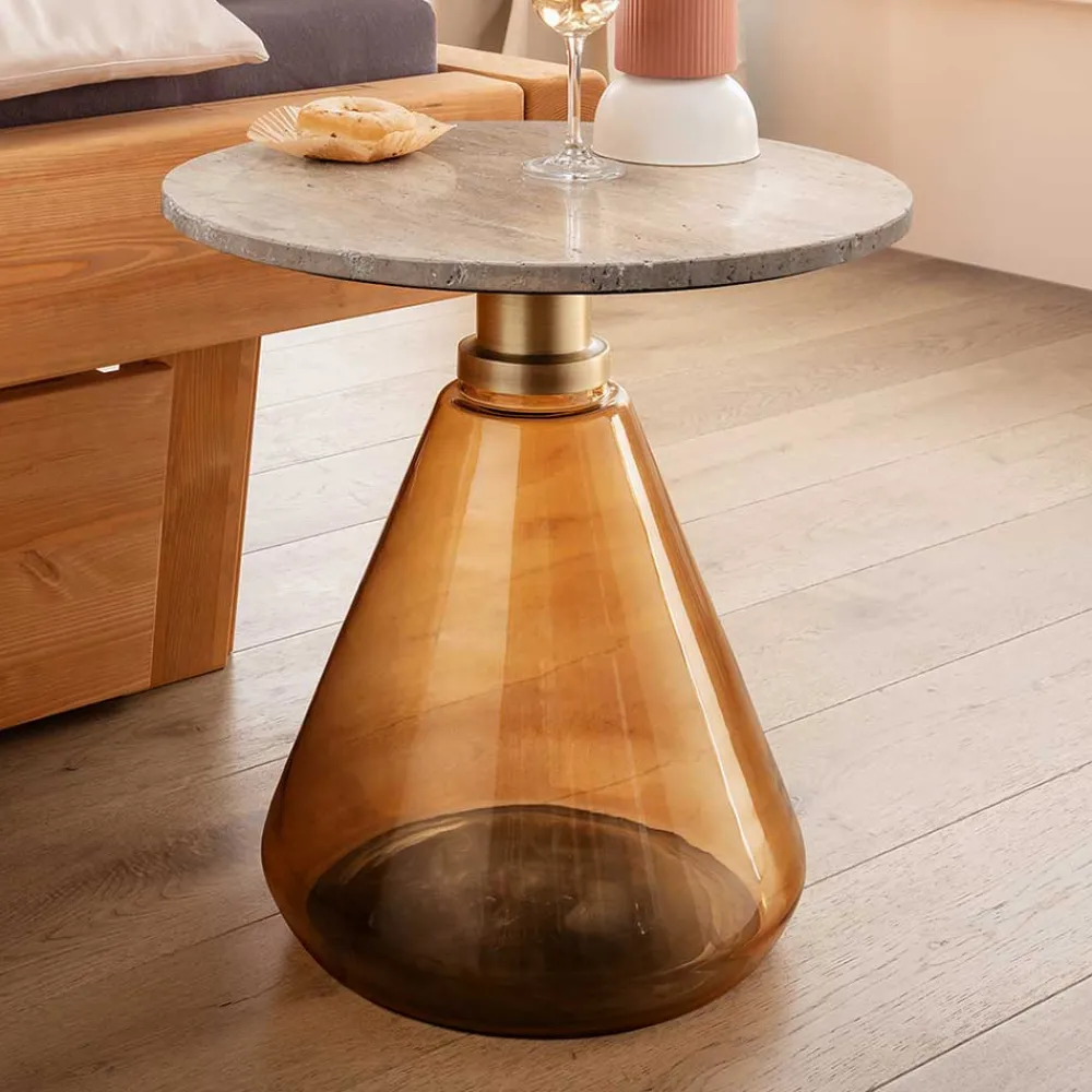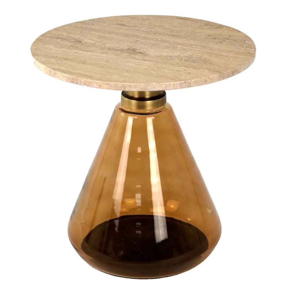 Der kegelförmige Sockel aus braun getöntem Glas trägt die Marmorplatte mit Leichtigkeit und Anmut. Das zarte Schimmern des Glases verleiht dem Tisch eine fast schwebende Wirkung, während die Metallmanschette oben einen stilvollen Akzent setzt und das Design perfekt abrundet. Diese Kombination aus Transparenz, Wärme und Glanz verleiht jedem Raum eine luxuriöse, aber zugleich wohnliche Atmosphäre.