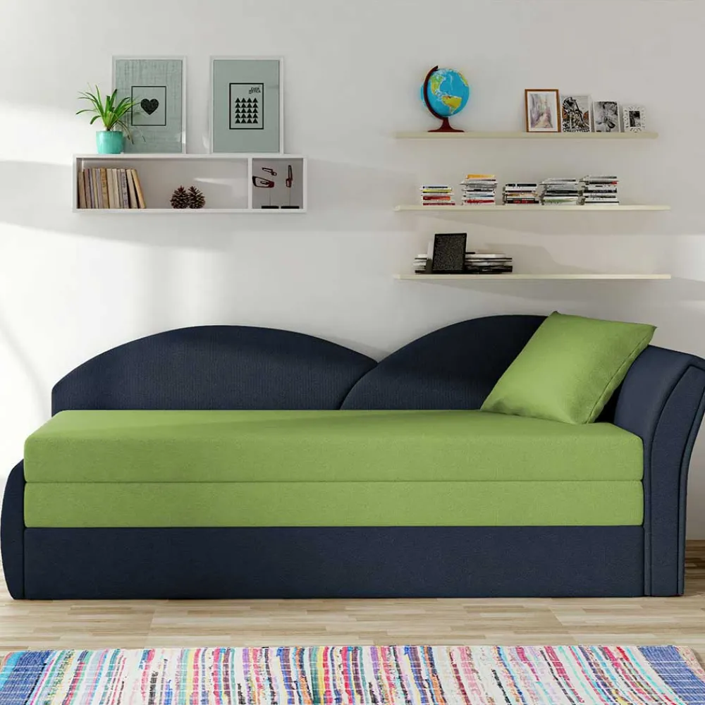 Die Bett-Recamiere „Cobagon“ besticht durch ihr harmonisches Design und eine Farbgestaltung, die Frische und Behaglichkeit ausstrahlt. Der Veloursbezug kombiniert ein dezentes Hellgrün mit einem tiefen Dunkelblau und schafft so einen charmanten Kontrast, der in jedes moderne Zuhause passt. Ob im Wohnzimmer, Gästezimmer oder Wintergarten – „Cobagon“ vereint Stil und Funktionalität.