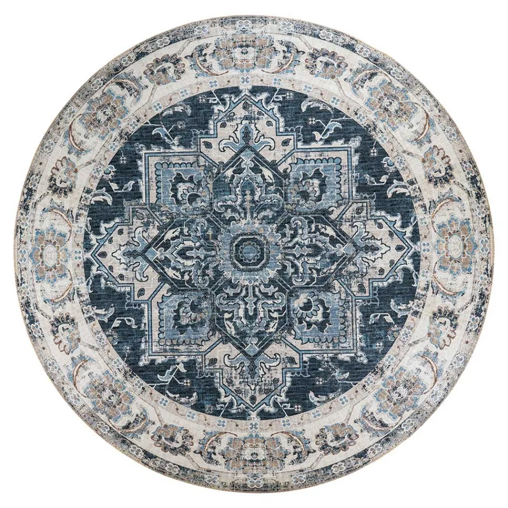 Dank seiner runden Form und der harmonischen blauen Farbgestaltung lässt sich der Teppich „Pontecuna“ flexibel in unterschiedlichste Wohnbereiche integrieren. Ob im Wohnzimmer, Schlafzimmer oder unter einem runden Tisch – er setzt überall stilvolle Akzente und verleiht Räumen einen Hauch von Exotik.