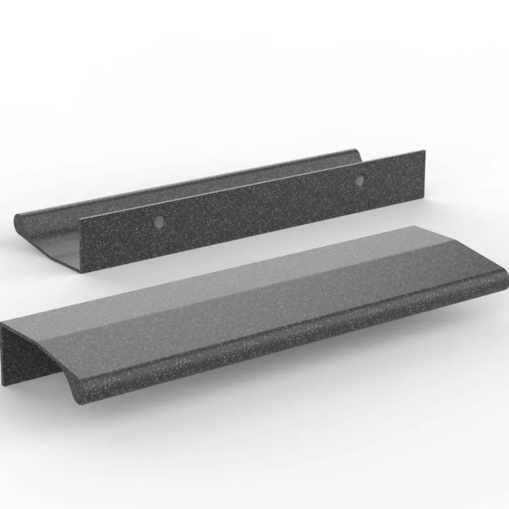 Die Fronten bestehen vollständig aus Holzwerkstoff mit einer dunkelbraunen Glasbeschichtung – pflegeleicht, widerstandsfähig und mit faszinierender Tiefenwirkung. Quer verlaufende Bauchbinden aus Massivholz Erle setzen strukturierende Akzente und verleihen der Fläche eine natürliche Lebendigkeit. Der Korpus ist aus folierter Spanplatte in Erle-Holzoptik gefertigt. Auch der Innenraum greift diese warme Holzoptik auf und schafft ein stimmiges Gesamtbild. Die schiefergrauen Aluminiumgriffe fügen sich dezent in das Design ein und unterstreichen die moderne Formsprache.