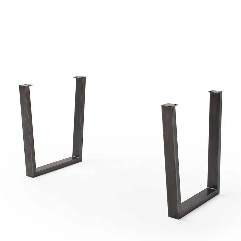 Das kantige Metall-Bügelgestell in Altsilber, mit einer gewischten Antik-Optik Oberfläche, besteht aus zwei Bügelbeinen im Trapez-Design mit breiter Bodenauflage. Dieses Design sorgt nicht nur für eine moderne Optik, sondern auch für höchste Stabilität und Standfestigkeit.