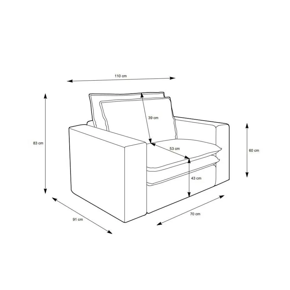 Neben dem ansprechenden Design und den hochwertigen Materialien zeichnet sich der Sessel „Anyna“ durch seine durchdachte Funktionalität aus. Die Maße (BxHxT) von 110x83x91 cm bieten großzügigen Platz, während die Armlehnen mit ca. 60 cm Höhe und 20 cm Breite den Sitzkomfort zusätzlich unterstützen. Die Sitzhöhe beträgt angenehme 43 cm, die Sitztiefe 53 cm und die Sitzbreite großzügige 70 cm. Ein kleines und ein großes loses Rückenkissen sorgen für zusätzliche Bequemlichkeit. Der Sessel kann dank des echt bezogenen Rückens frei im Raum platziert werden und ist mit einer maximalen Belastbarkeit von 150 kg äußerst robust.