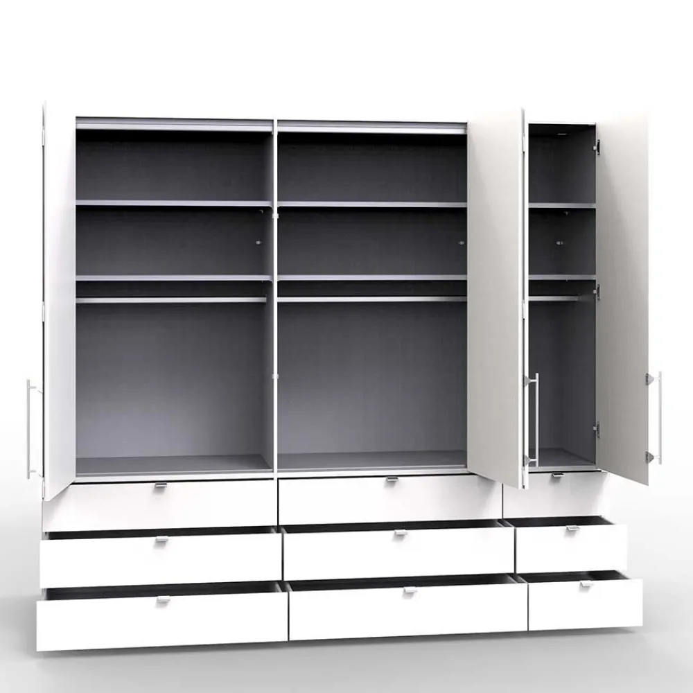 Der Kleiderschrank „Crenba“ verfügt über insgesamt neun Schubkästen in zwei verschiedenen Größen. Diese Schubkästen sind mit einem Metallauszug, Soft Close und Selbsteinzug ausgestattet, was ein leises und sanftes Schließen gewährleistet.