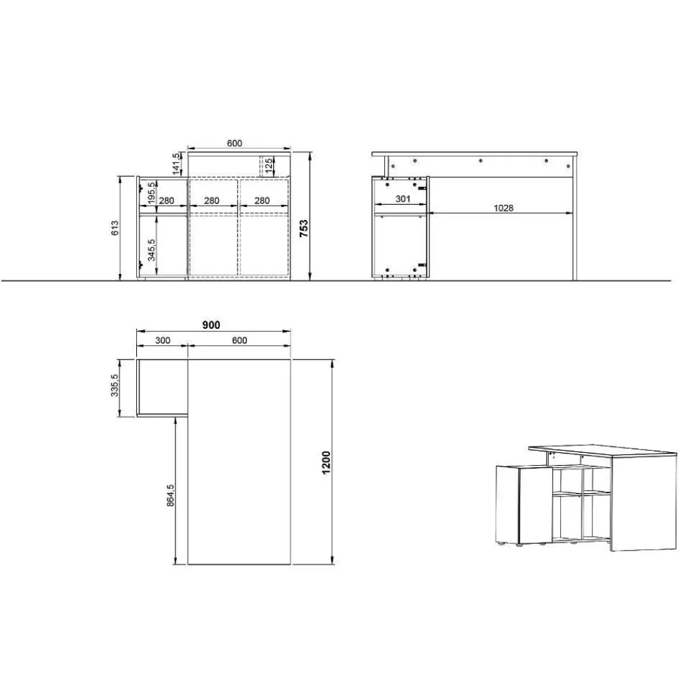 Das fest integrierte Seitenregal ist maßgeblich für die Winkelform des Schreibtisches verantwortlich. Es bietet eine Tür sowie vier offene Fächer, die vielseitige Ablagemöglichkeiten für Dokumente, Bücher oder Bürozubehör schaffen. Die durchdachte Anordnung erleichtert den Zugriff auf häufig benötigte Materialien, ohne die Arbeitsfläche zu überladen.